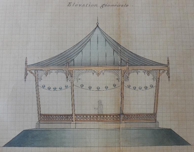 Croquis d'un kiosque pour musiciens : élévation géométrale, signé Edmond Bassac, 14 juin 1889, AM Vannes 52 FiImmatriculation