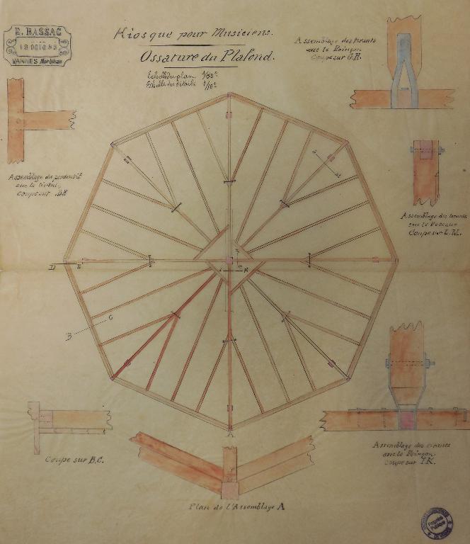 Kiosque pour musiciens : Ossature du plafond, signé edmond Bassac, 18 octobre 1889. AM Vannes 52 FiImmatriculation