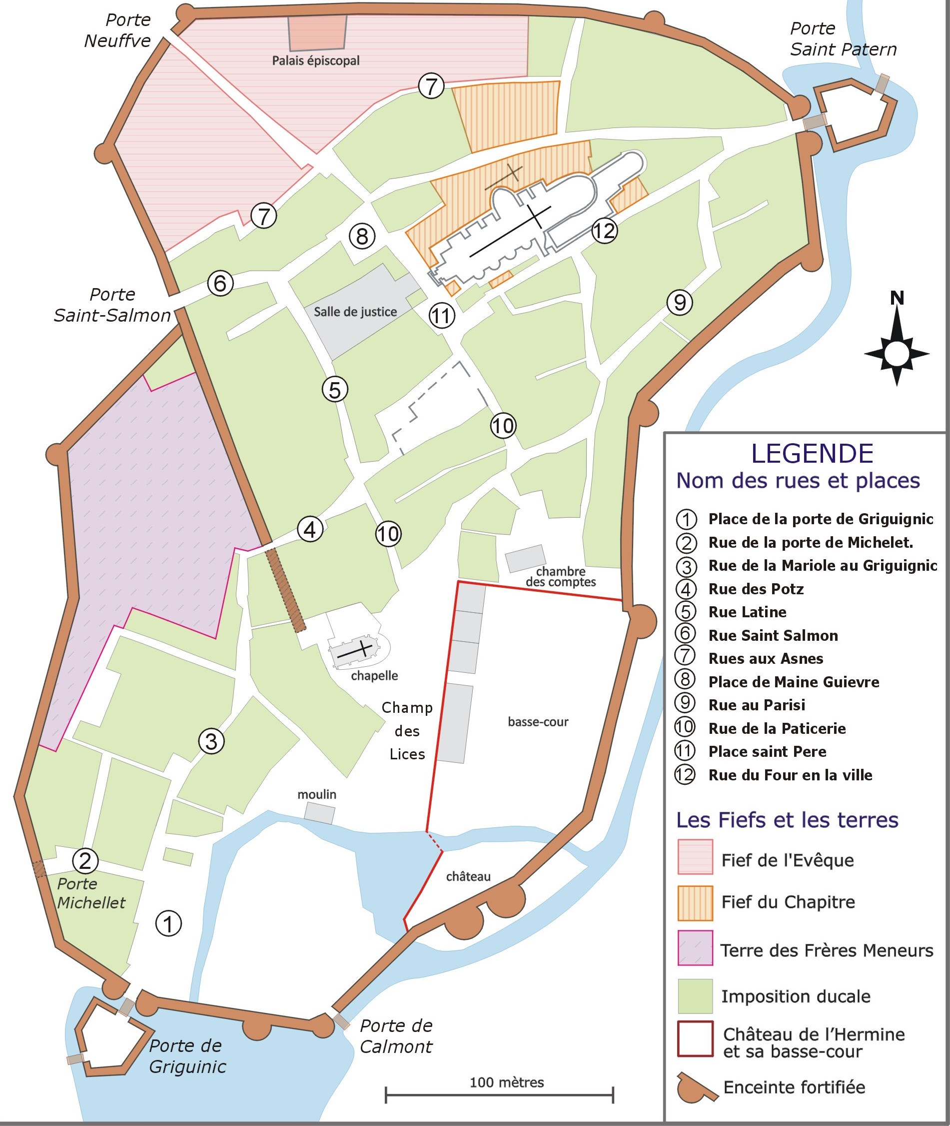 Dénomination des rues, places et portes de ville d'après les données du livre rentier (1455-1458). Fonds de plan : cadastre napoléonien de 1809. Dessin Marion Mauvais..Immatriculation
