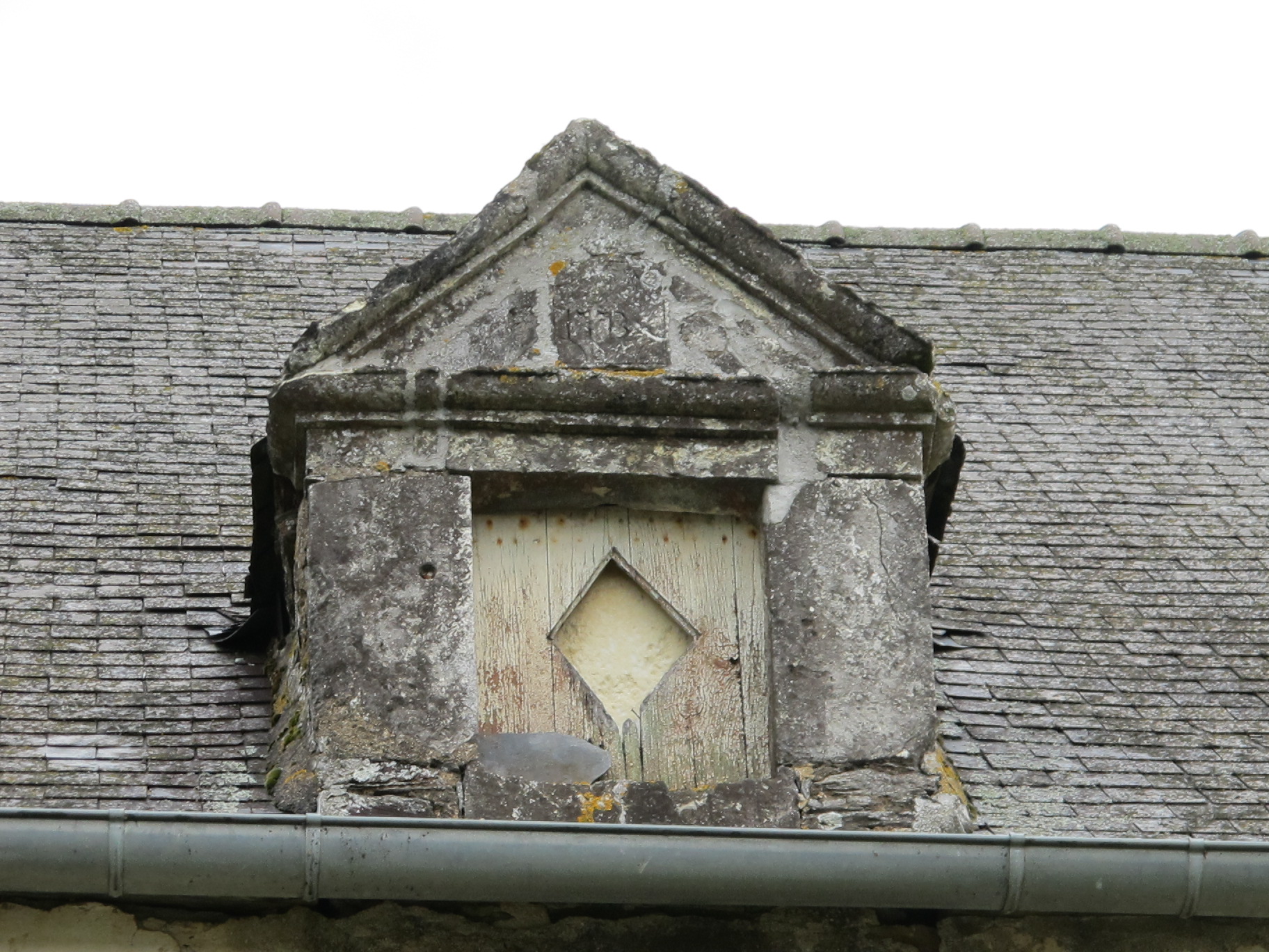 Manoir, élévation sud, partie est : la lucarne en calcaire (état en 2014)Immatriculation