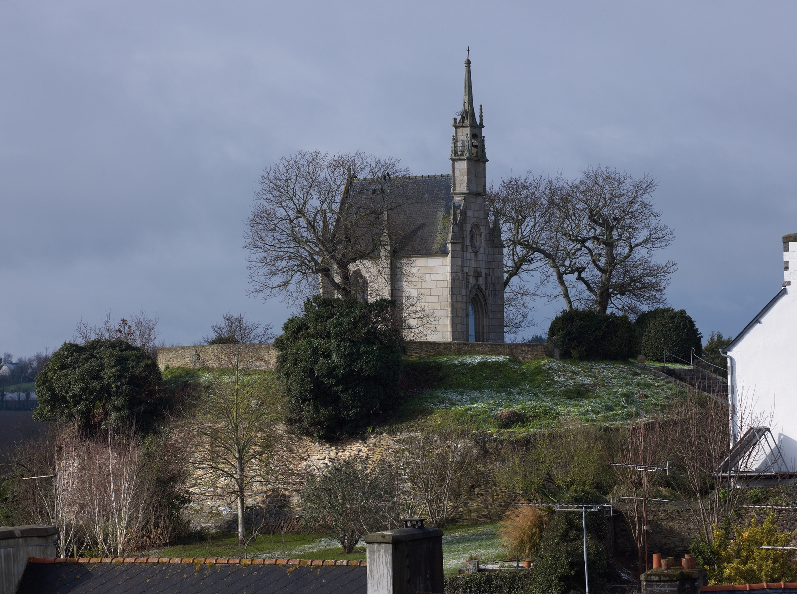Chapelle du Calvaire établie à l'emplacement de l'ancien château de La Roche-Derrien. Vue générale sud-estImmatriculation