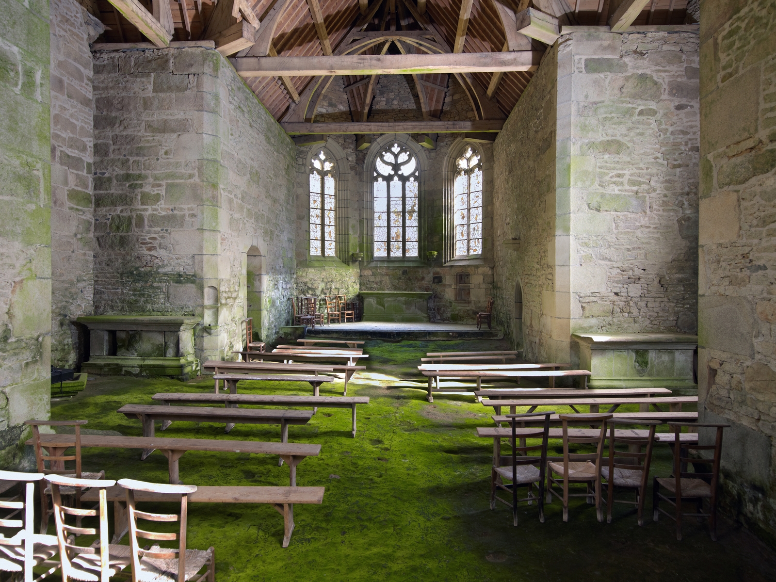Plufur : chapelle Saint-Nicolas, vue intérieure, cœur éclairé de trois verrières, maitre-autel et niche-crédence, charpente restaurée. Transepts nord et sudImmatriculation