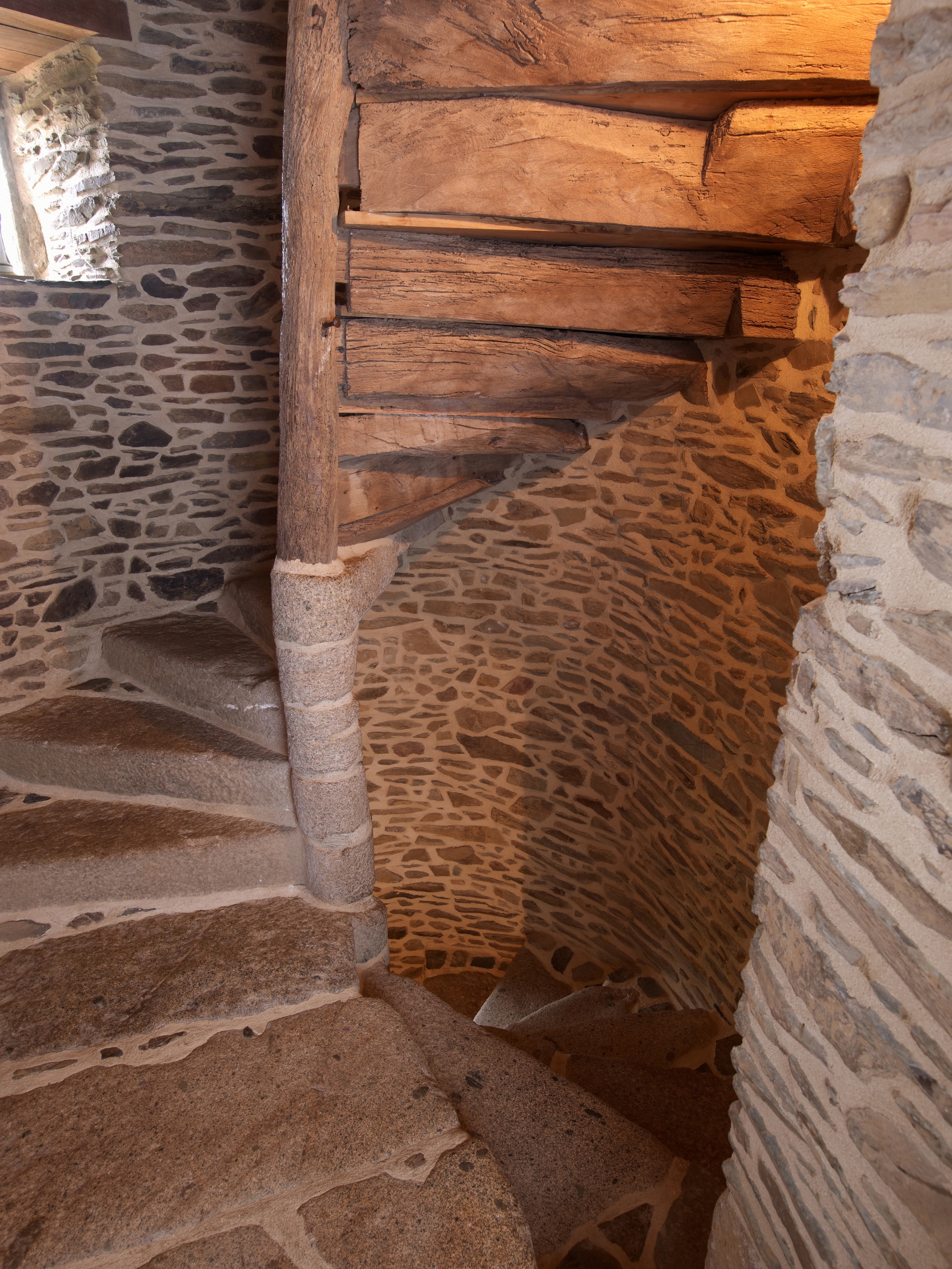 Manoir. Intérieur de la tour d'escalier : transition entre marches en pierre et marches en boisImmatriculation