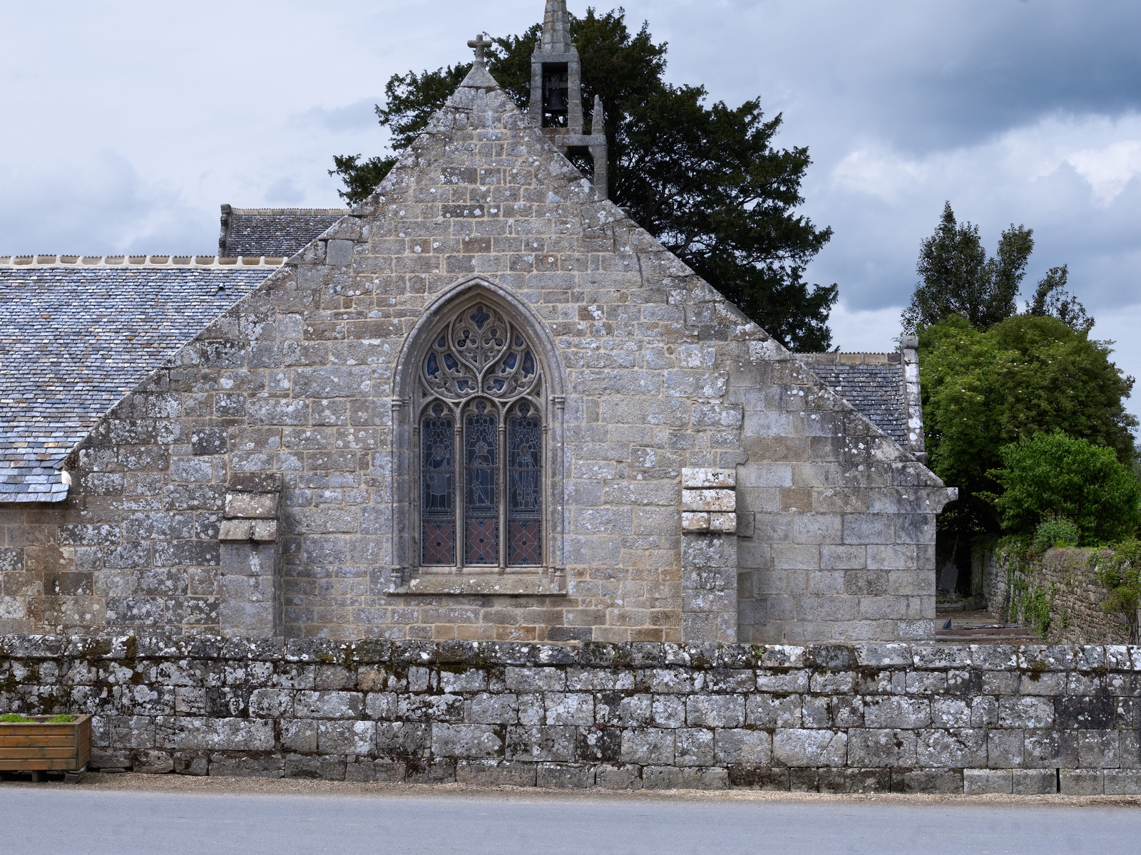 Plouzélambre, le bourg, enclos paroissial : église Saint-Sylvestre, chevet plat percé d'un fenestrage gothique flamboyant (il rappelle celui de l'église de Plouaret datée de 1470-1480)Immatriculation