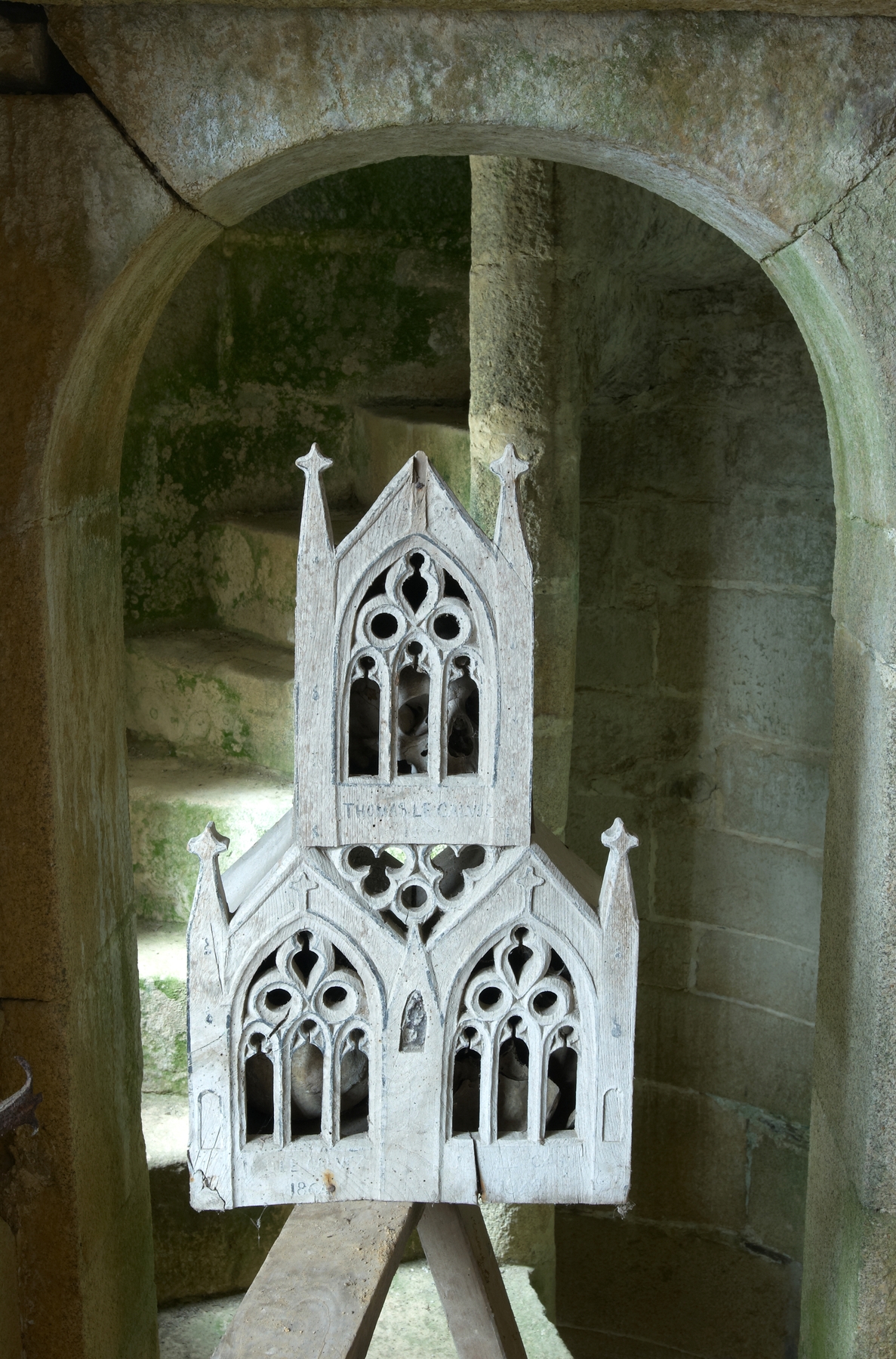 Plouzélambre, le bourg, enclos paroissial : église Saint-Sylvestre, porche monumental sud, secrétairerie située à l'étage. Du mobilier est entreposé dans cette pièce : ici, une exceptionnelle boite à crâne tripleImmatriculation