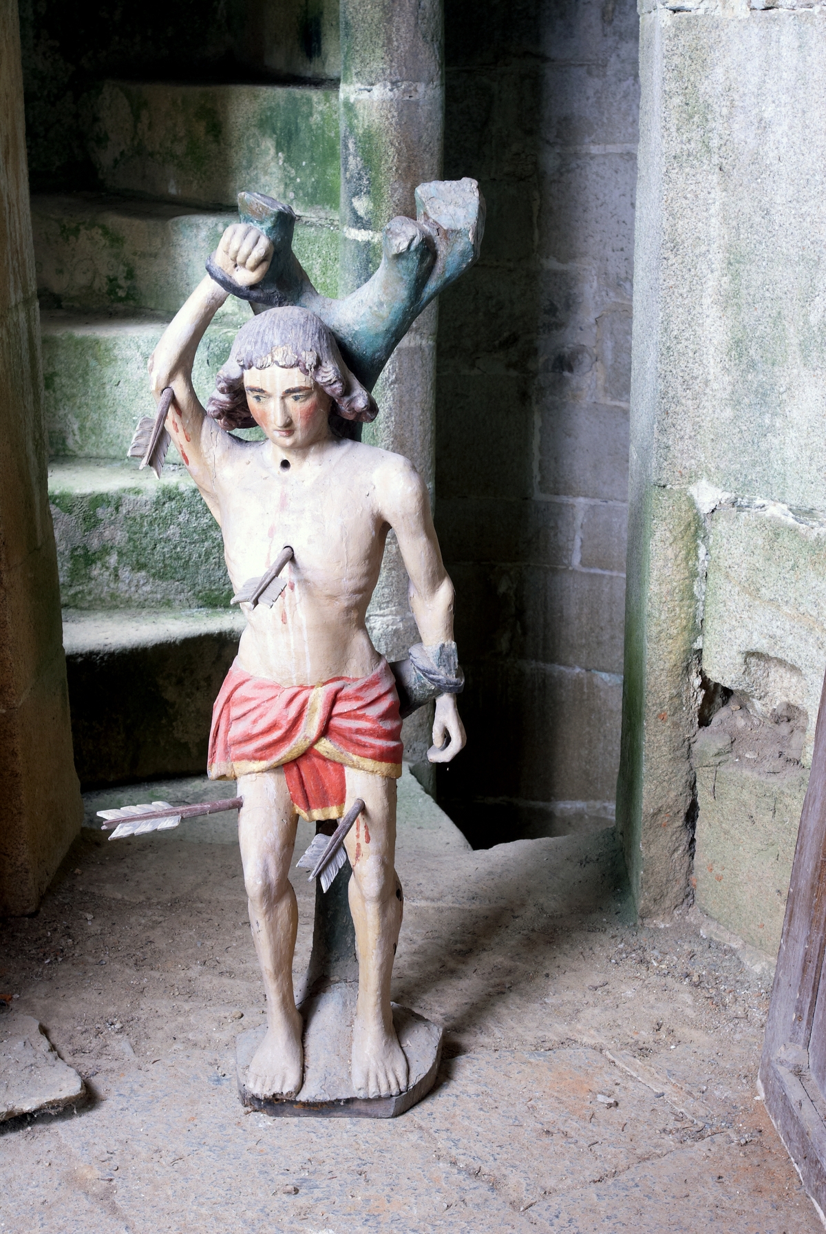 Plouzélambre, le bourg, enclos paroissial : église Saint-Sylvestre, porche monumental sud, secrétairerie située à l'étage. Du mobilier est entreposé dans cette pièce : ici, un saint Sébastien en bois polychrome (17e siècle)Immatriculation
