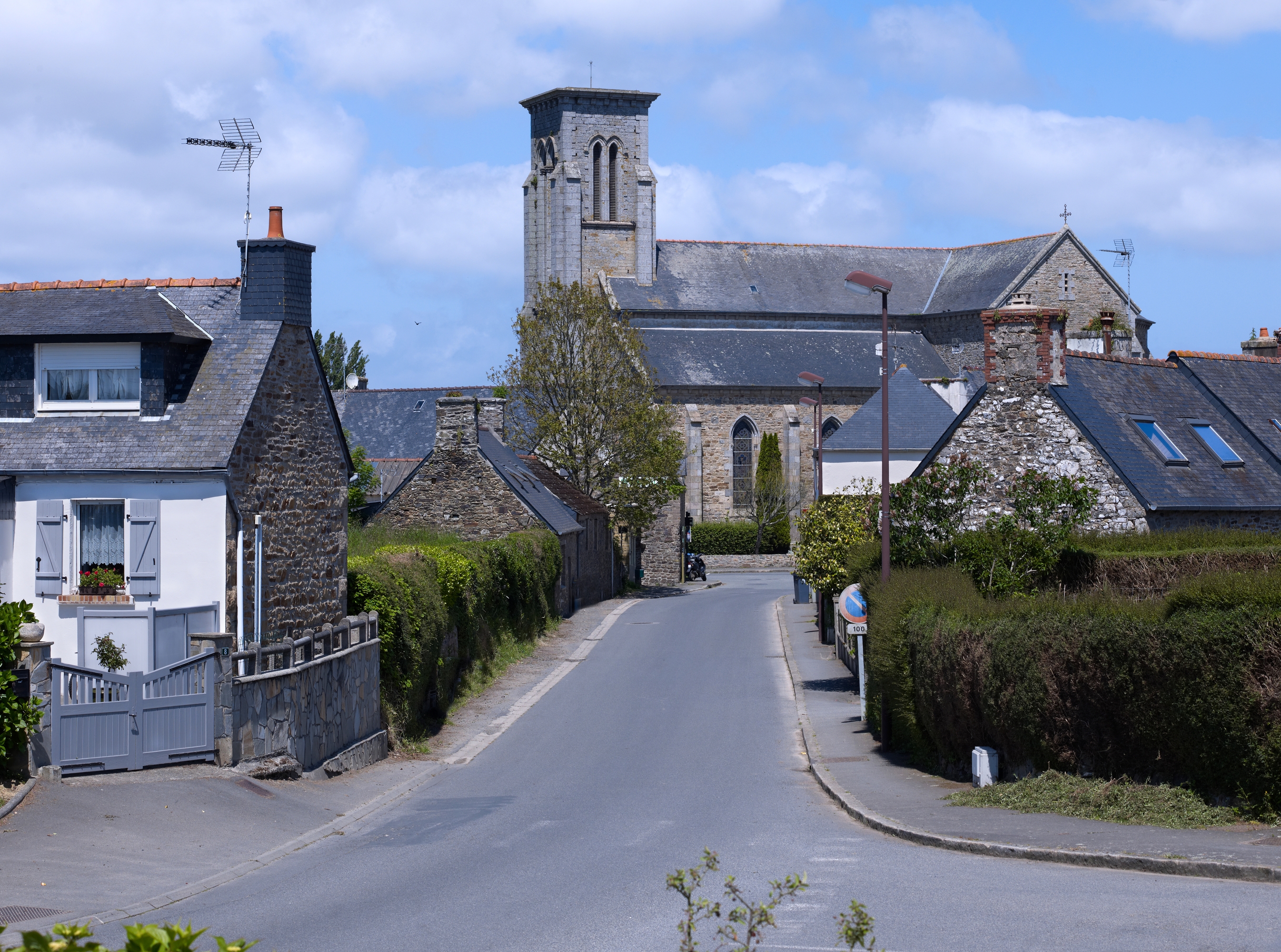 Rospez, le bourg : la route de Buhulien dans le bourg et l'église paroissiale Saint-Pierre et Saint-PaulImmatriculation