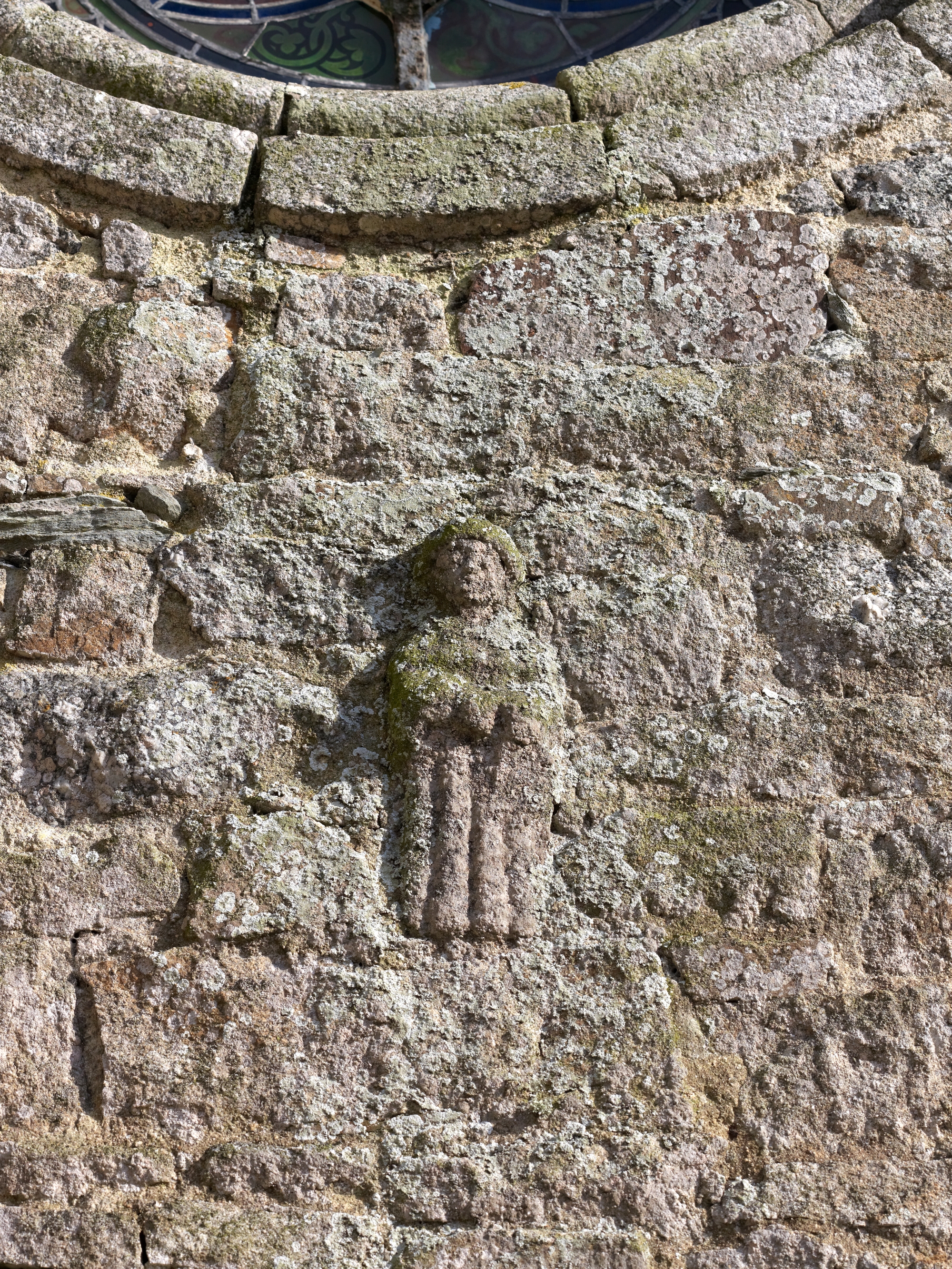 Rospez, le bourg : église paroissiale, transept nord, statue ancienne (un moine ?) intégrée dans la maçonnerieImmatriculation