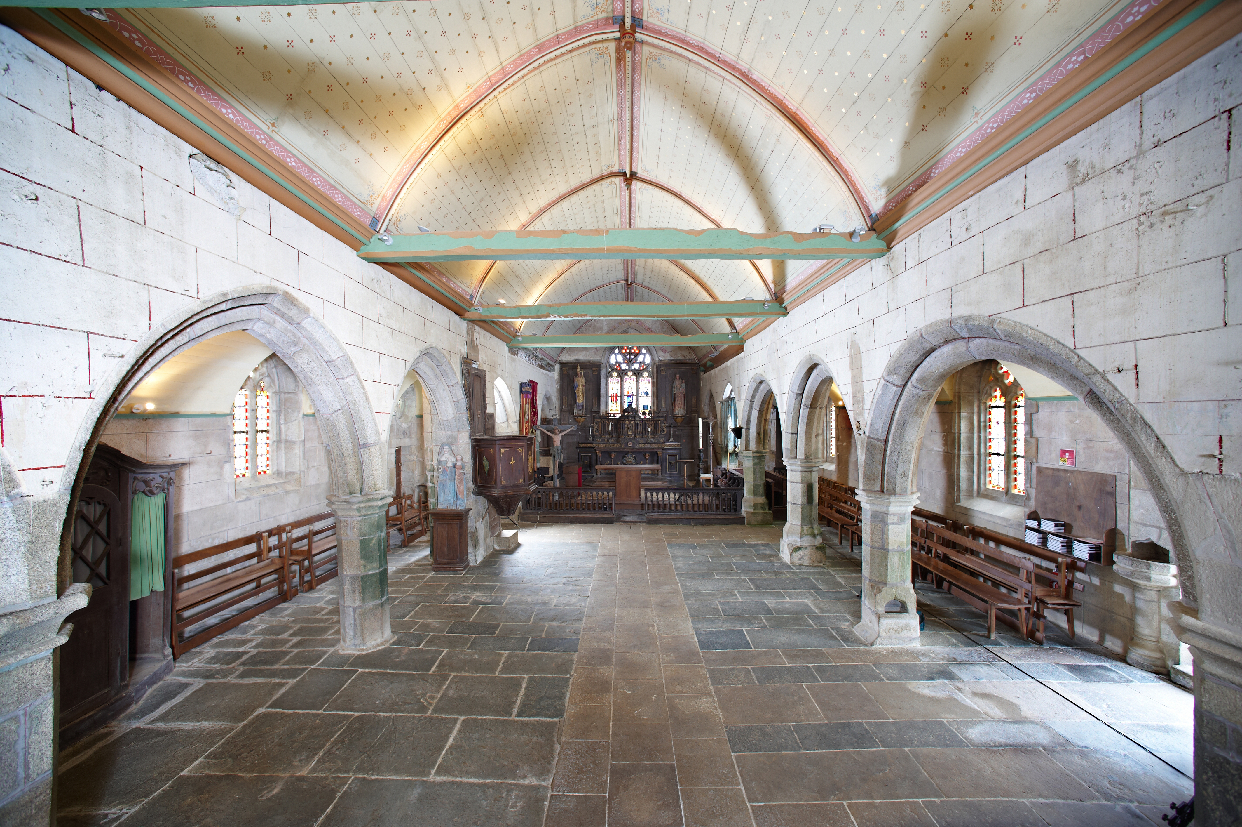Plouzélambre, le bourg, enclos paroissial : église Saint-Sylvestre, vue intérieure, nef, vers le choeurImmatriculation