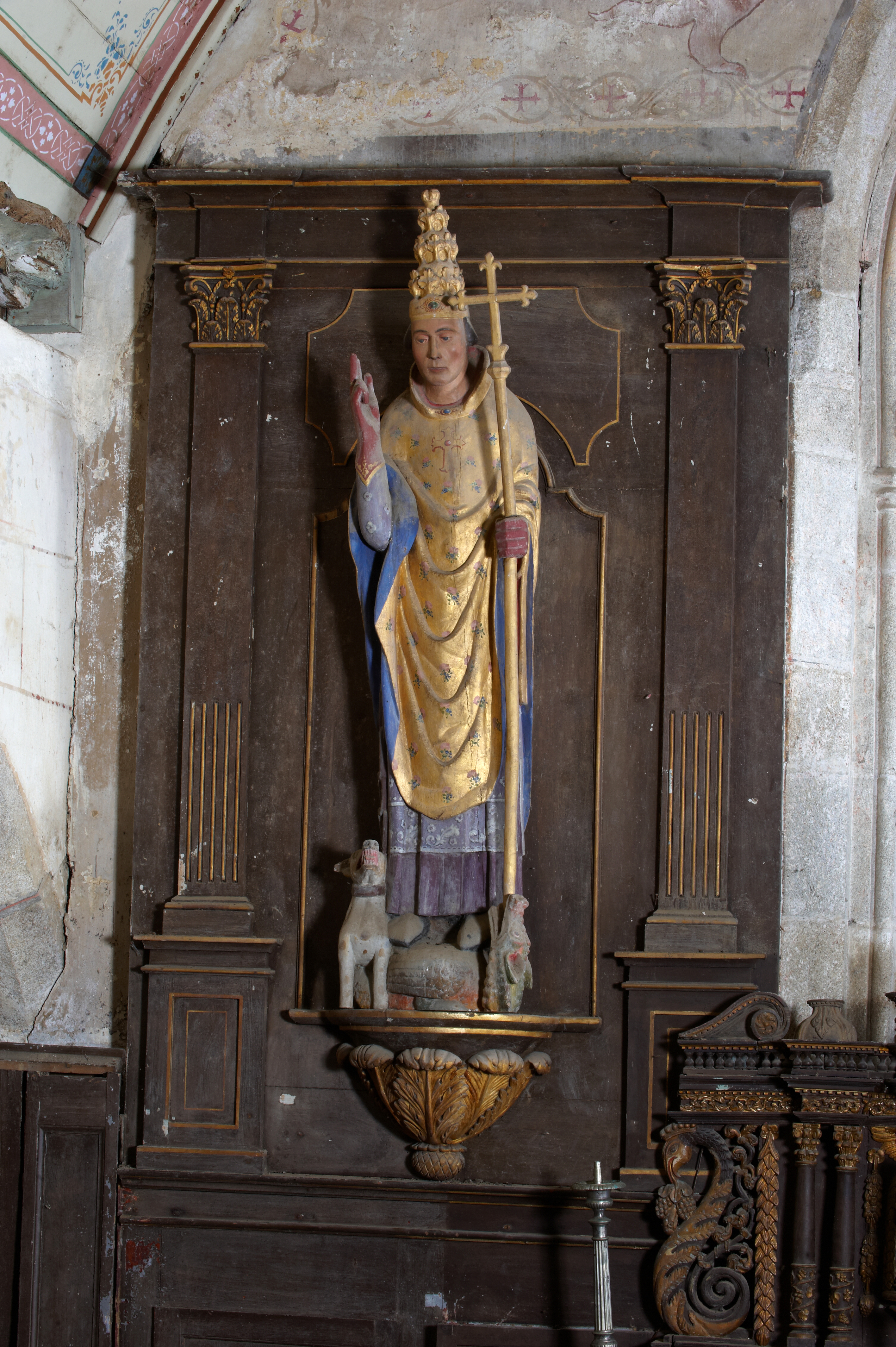 Plouzélambre, le bourg, enclos paroissial : église Saint-Sylvestre, choeur, statue de saint Sylvestre (18e siècle). Le saint, la tiare au front et la crosse à la main, est représenté en pape. A ses pieds des monstres, qu'il tient enchaînés à sa ceinture et un chien (comme saint Gildas son frère qui a la réputation de guérir la rage)Immatriculation