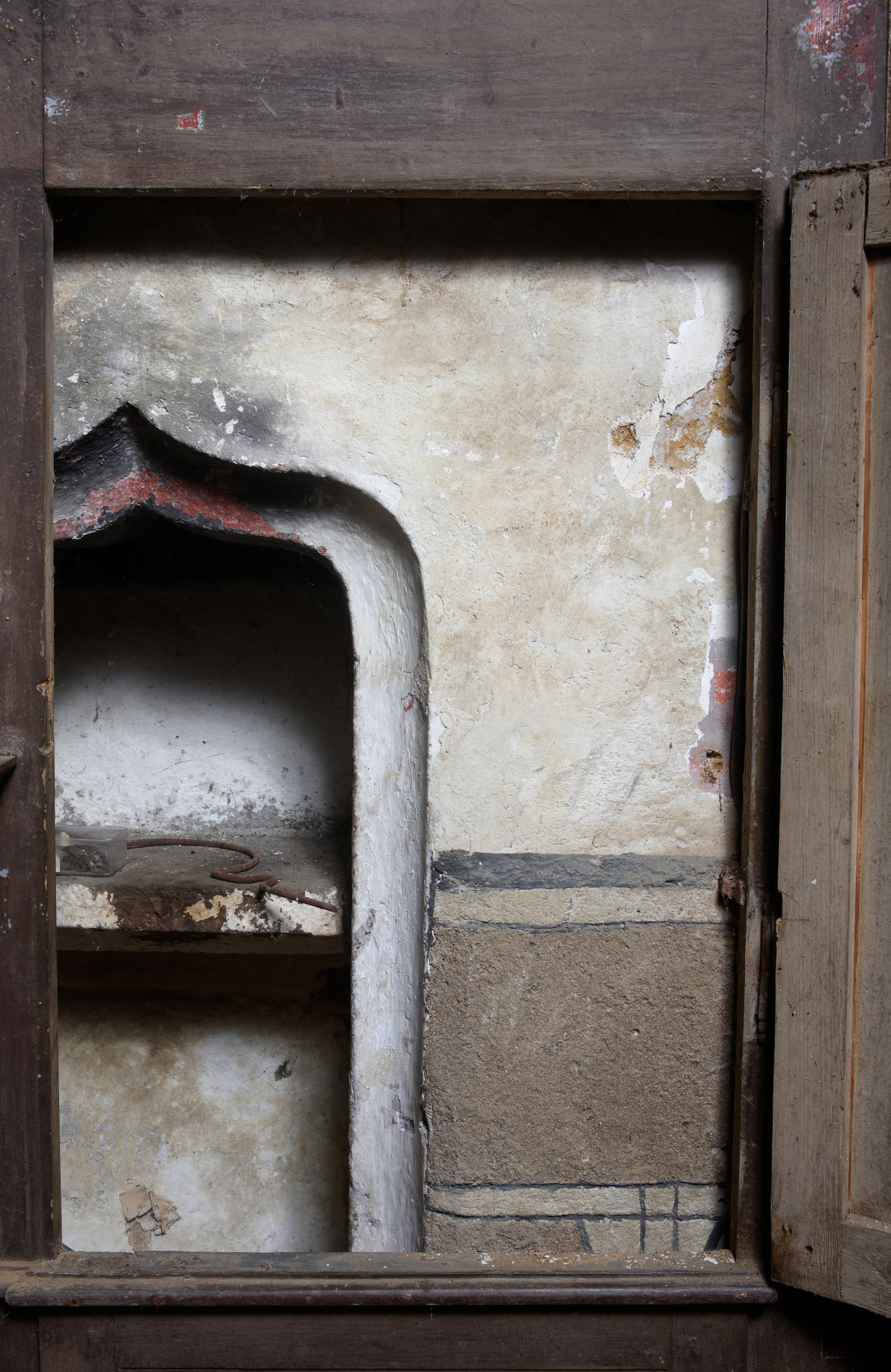Plouzélambre, le bourg, enclos paroissial : église Saint-Sylvestre, niche aménagée dans l'épaisseur du mur du chevet (crédence liturgique du maitre-autel). Des traces de polychromie sont visiblesImmatriculation