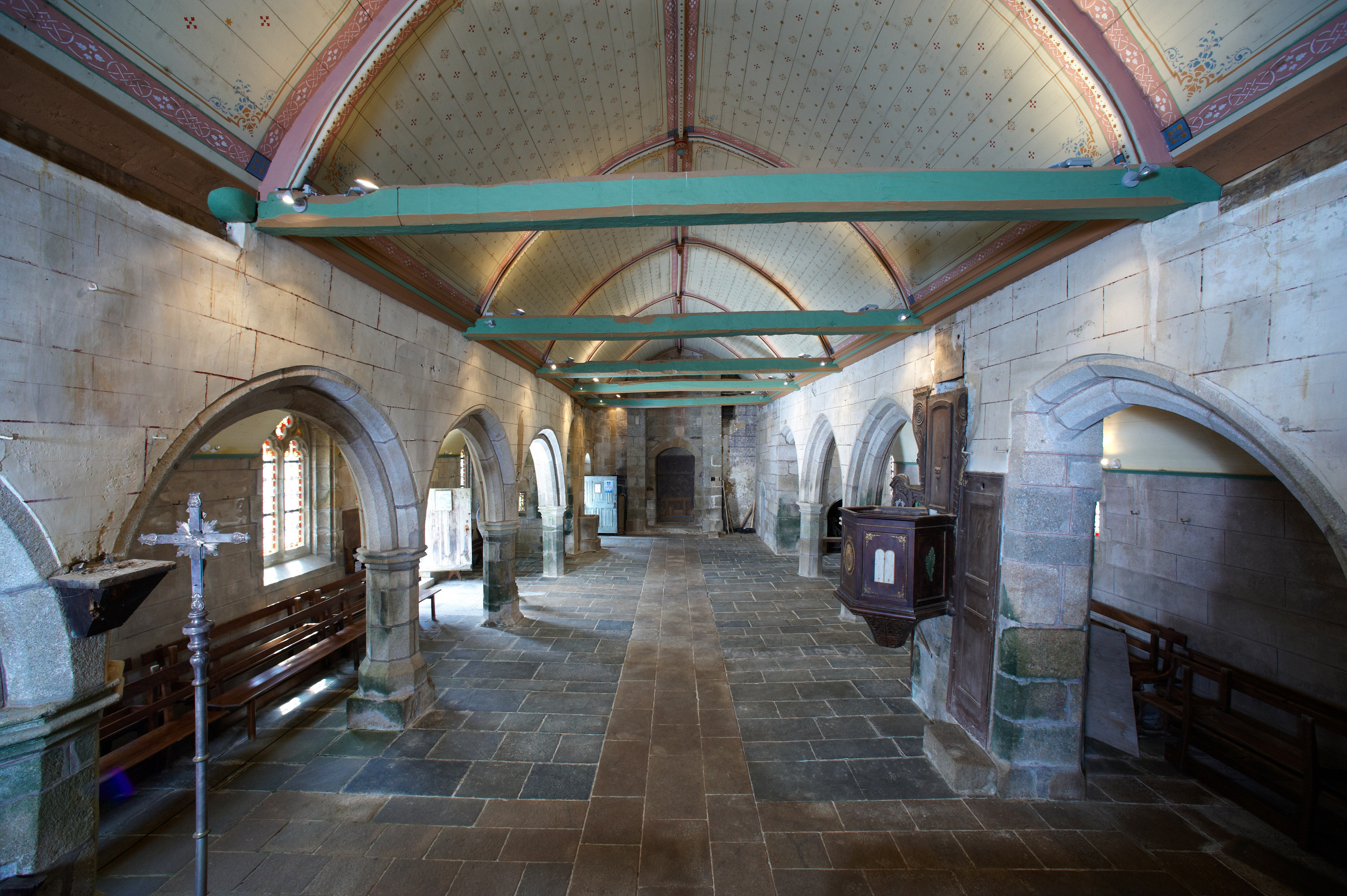 Plouzélambre, le bourg, enclos paroissial : église Saint-Sylvestre, vue intérieure, nef, vers l'ouest. A droite : la chaire à prêcherImmatriculation