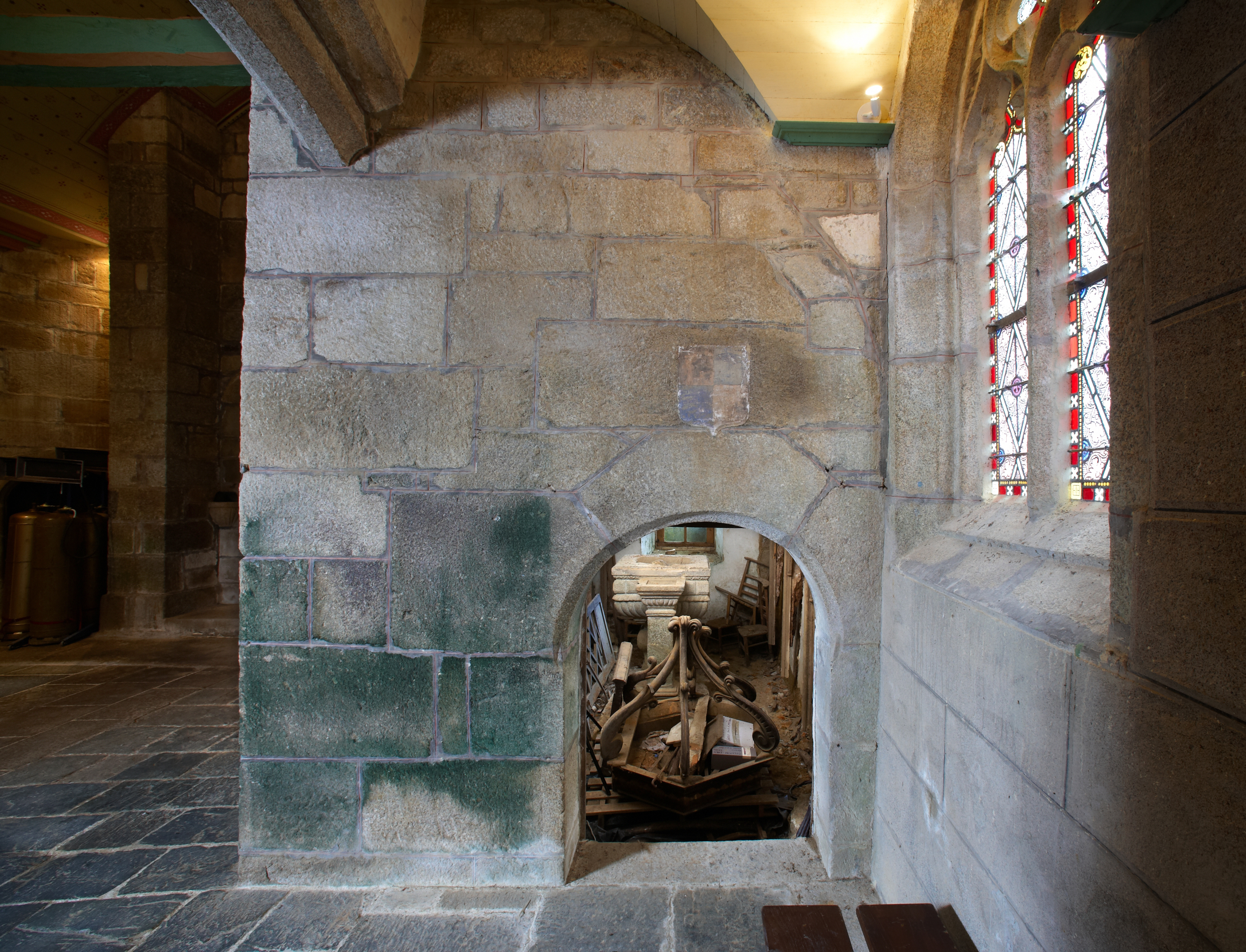 Plouzélambre, le bourg, enclos paroissial : église Saint-Sylvestre, vue intérieure, nef, extrémité ouest, porte de la chapelle des fonts baptismauxImmatriculation