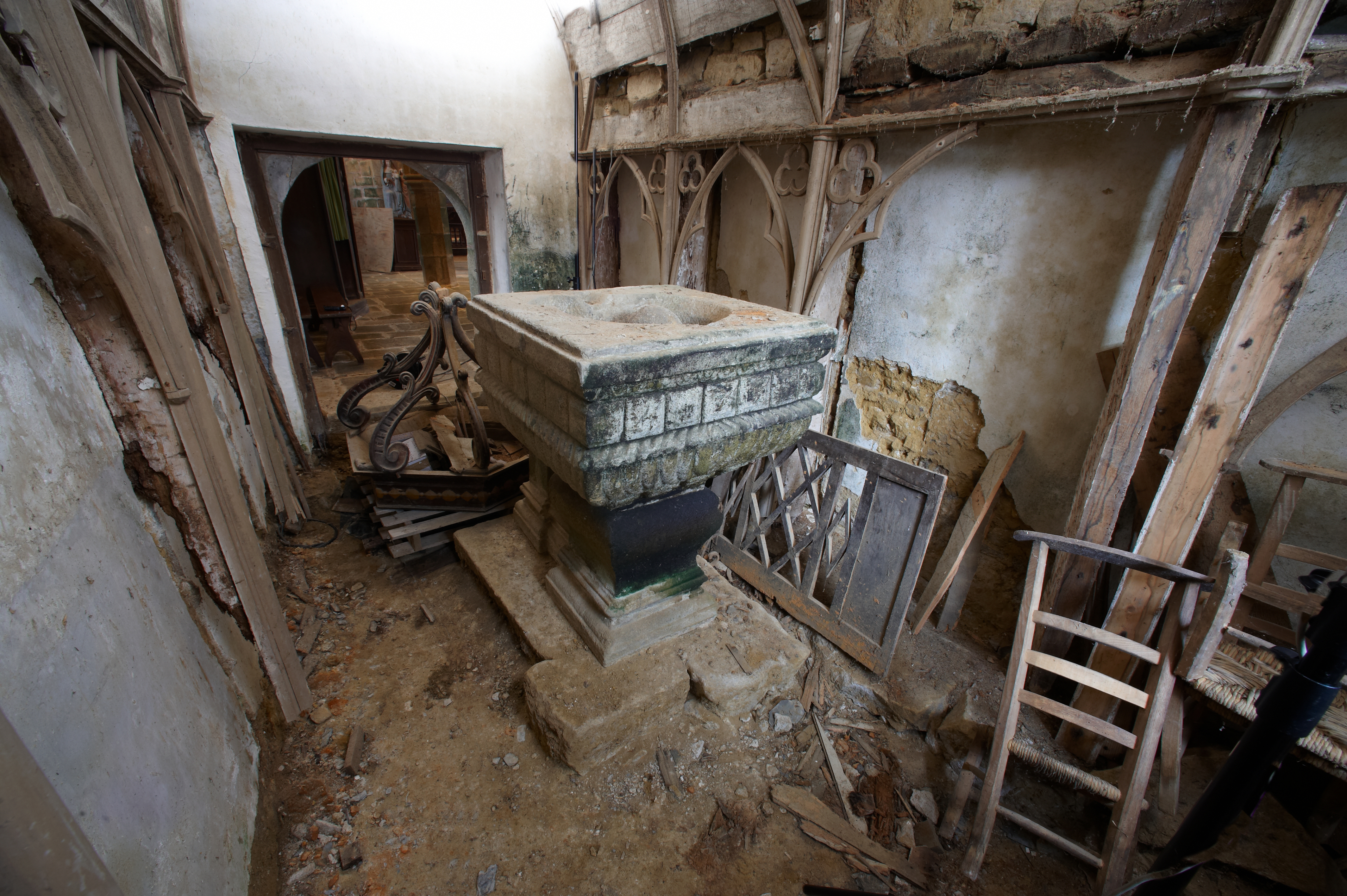 Plouzélambre, le bourg, enclos paroissial : église Saint-Sylvestre, vue intérieure, chapelle des fonts baptismaux, voûte lambrissée, boiseries et porte de clôture datée 1851. Cuve baptismale en granite Renaissance (fin 16e siècle)Immatriculation
