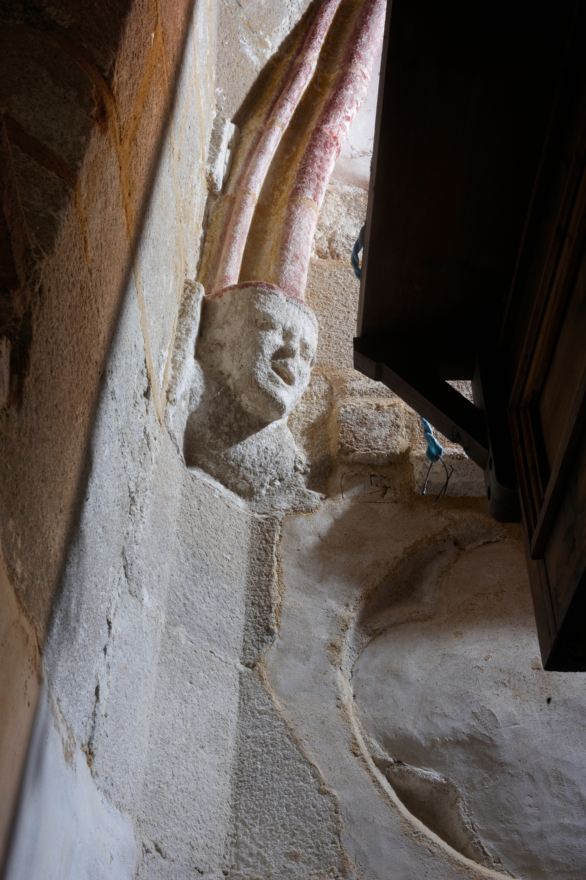 Revers façade occidentale, culot sculpté et détail du garde-corps obturé.Immatriculation
