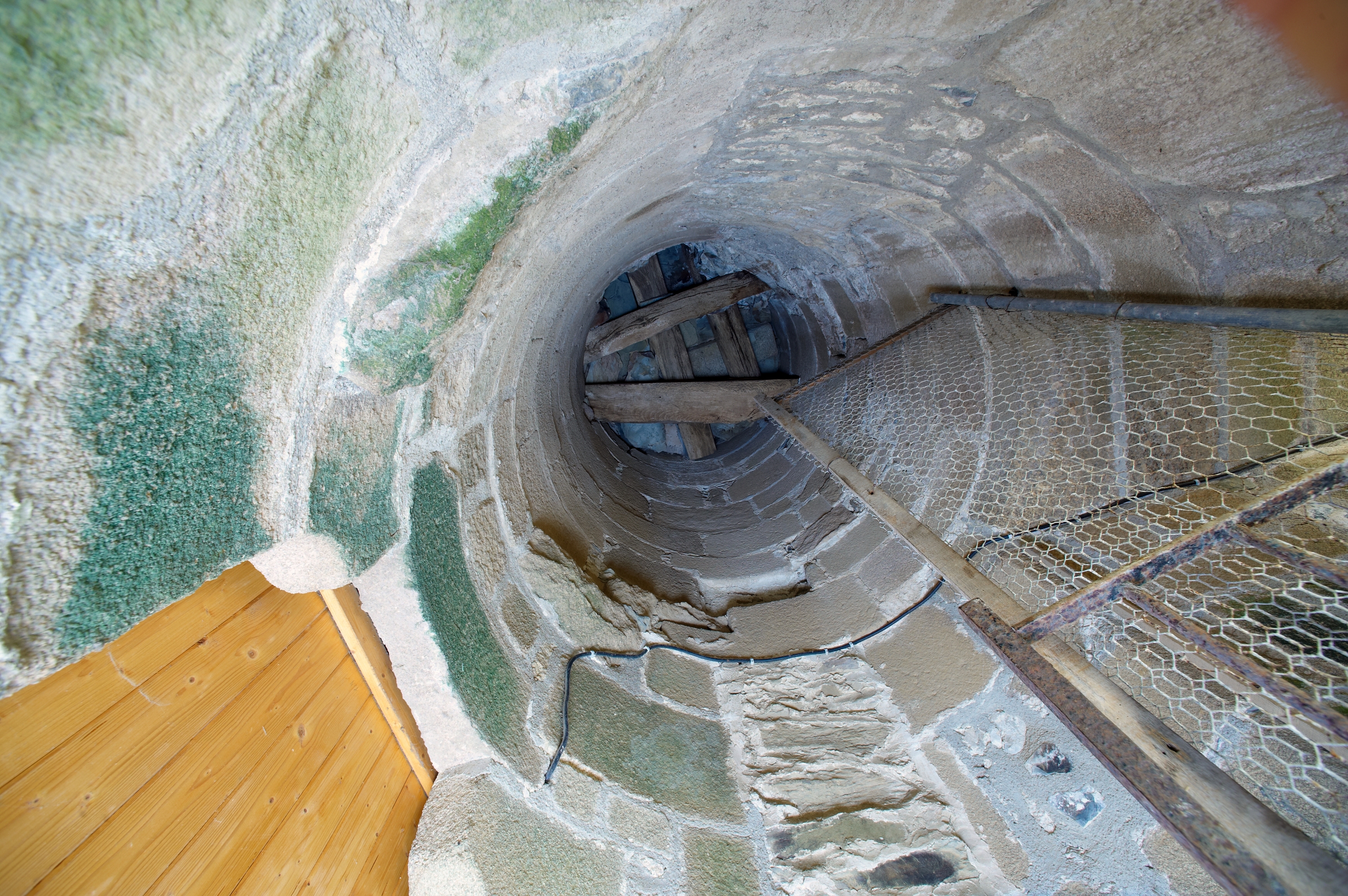 Massif nord-ouest, escalier en vis, vue vers le sommet avec traces de marches arrachées.Immatriculation