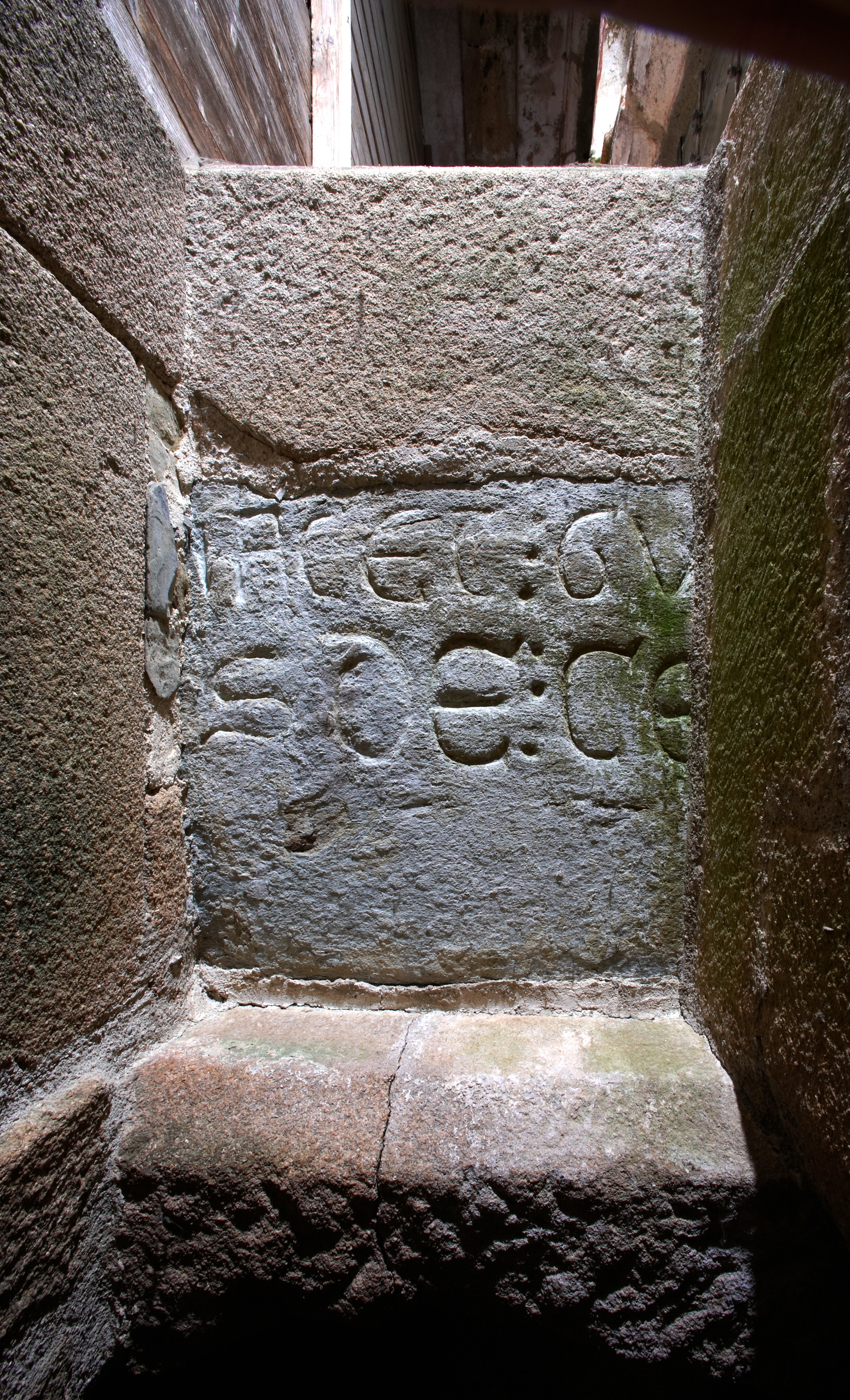 Tour sud-ouest, passage, fragment de pierre tumulaire remployé en linteau.Immatriculation