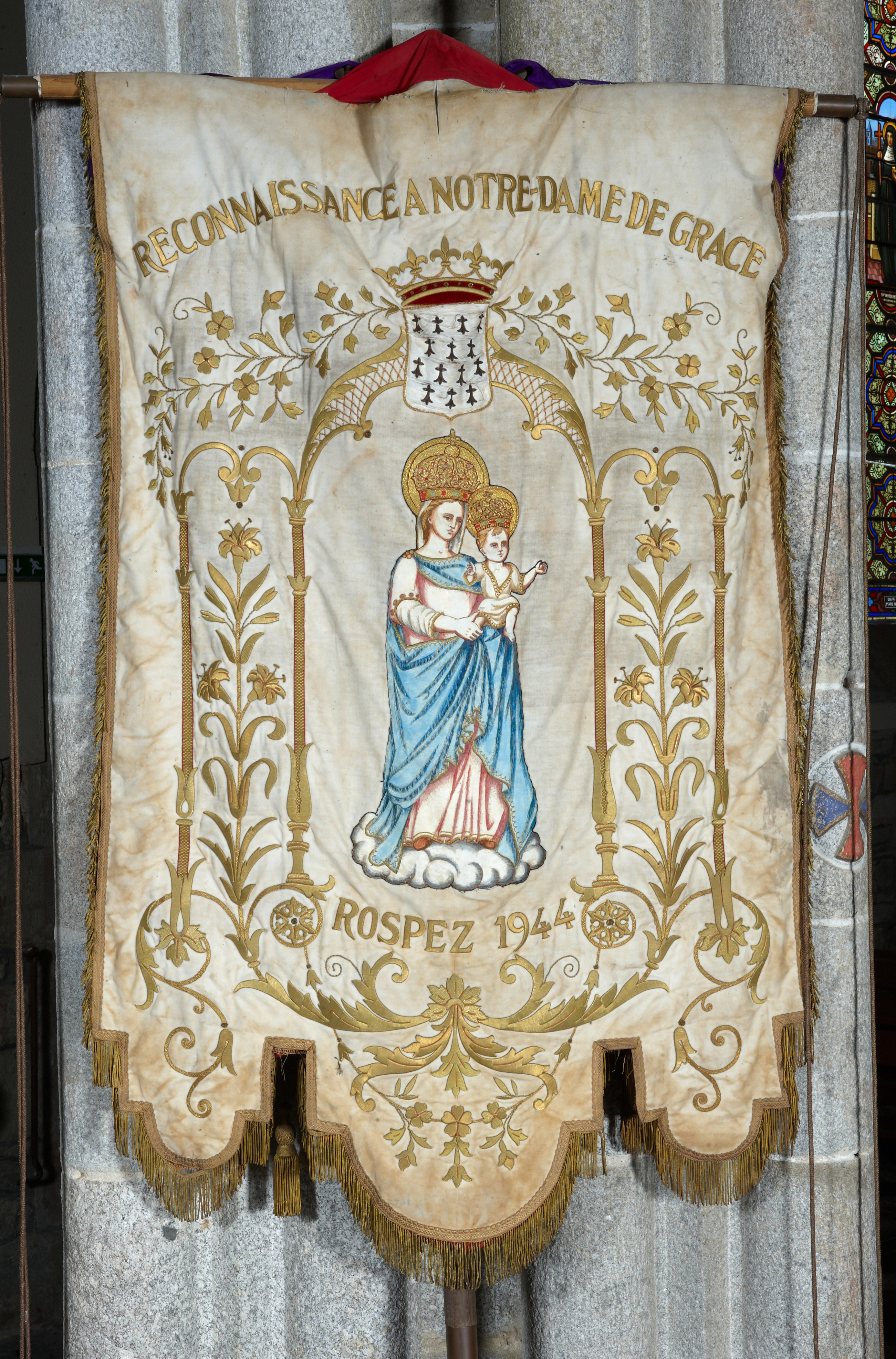 Rospez, le bourg : église paroissiale, bannière de Notre-Dame de GrâceImmatriculation