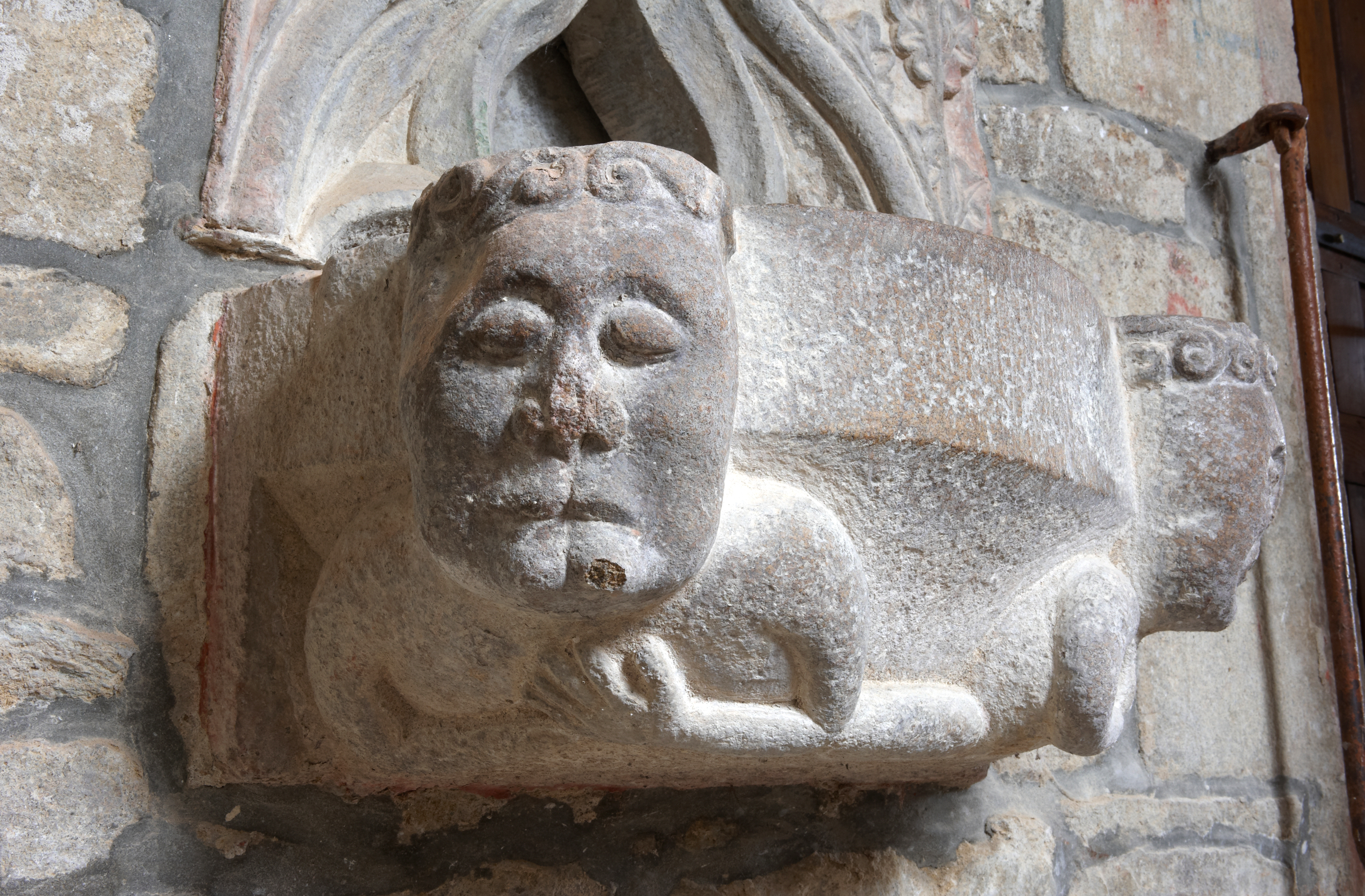 Rospez, le bourg : église paroissiale, personnage sculpté sur la cuve du bénitierImmatriculation