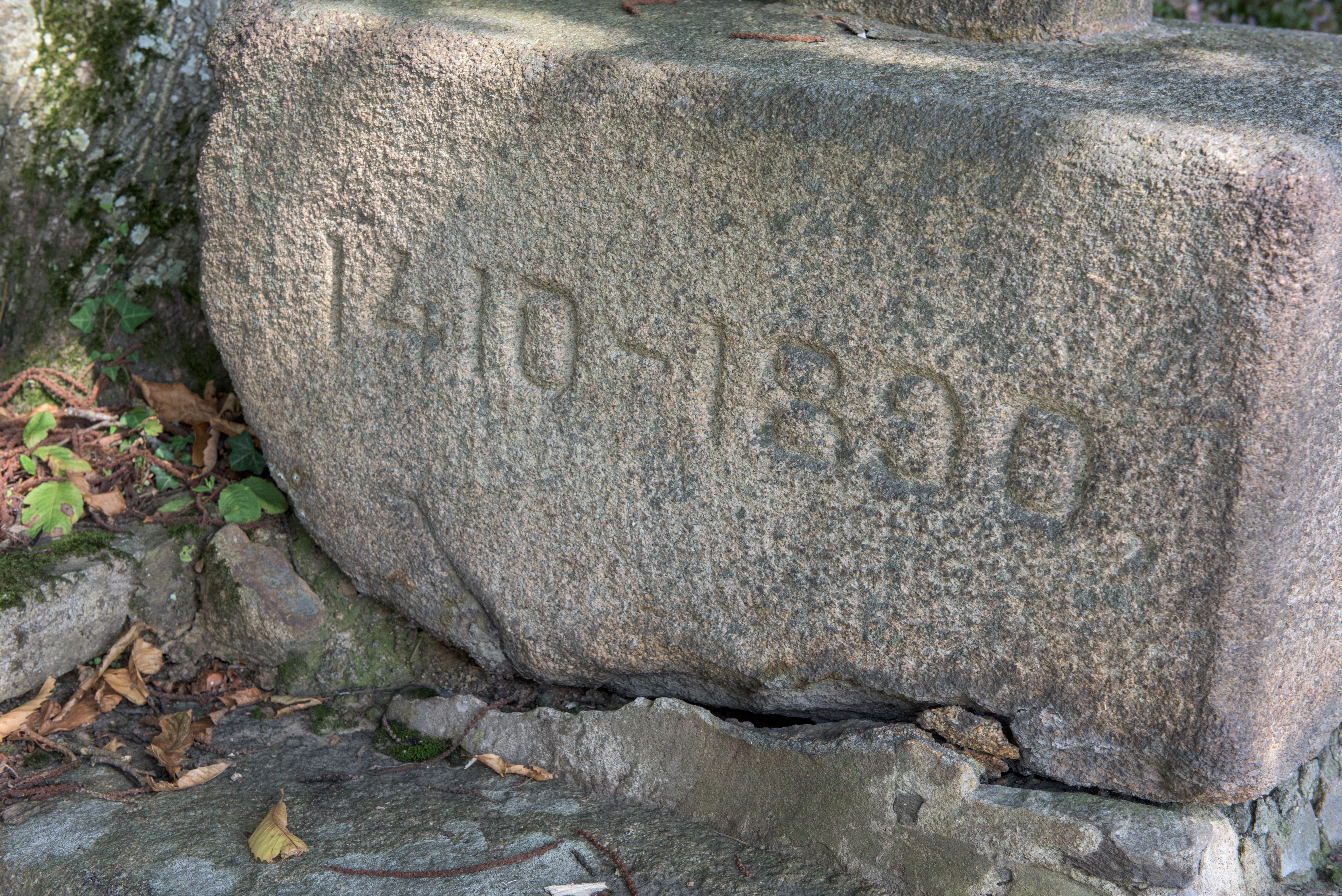 Rospez : croix de chemin, dite Croas an Bec Houarn, socle, millésimes 1410 et 1890Immatriculation