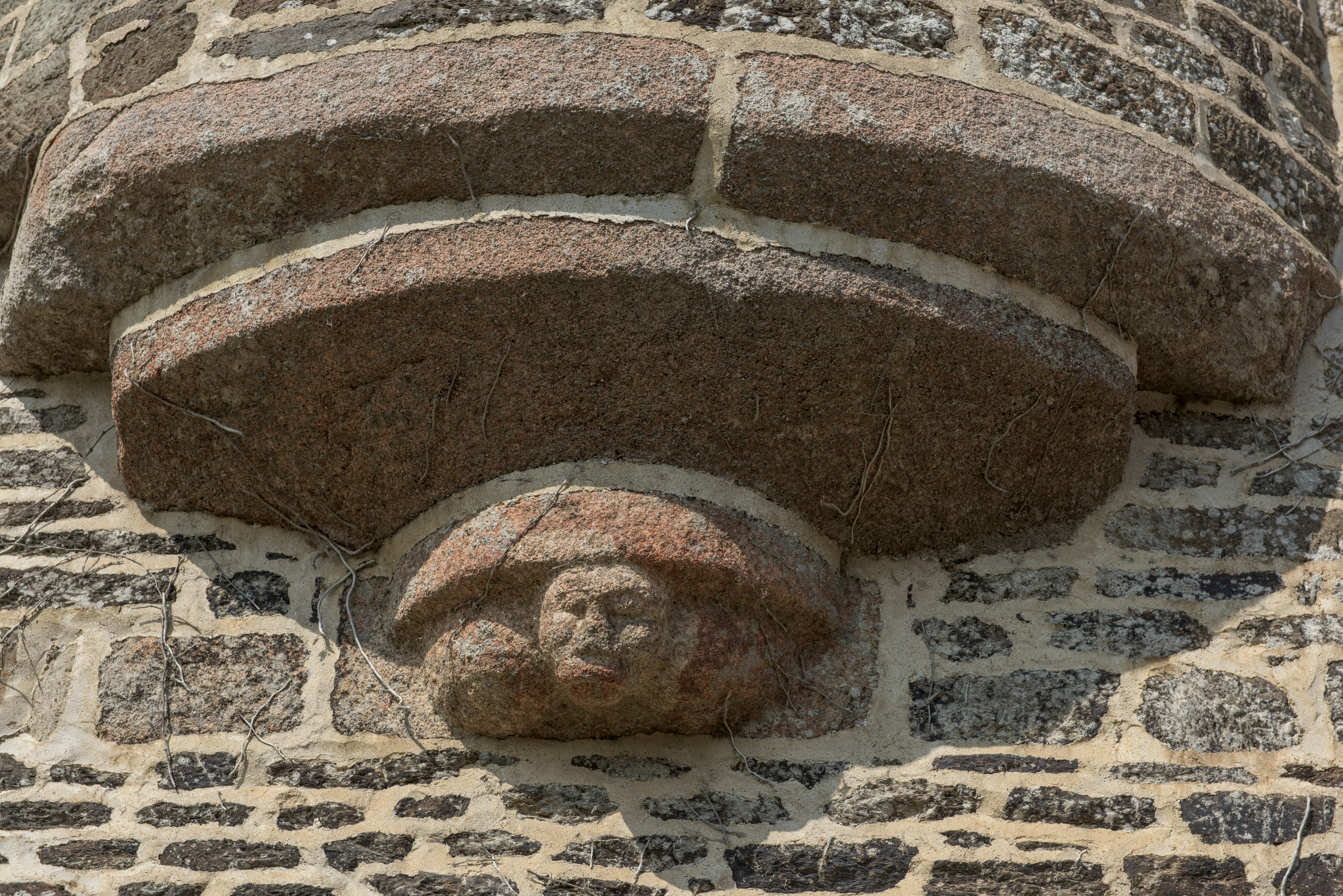 Rospez, manoir de Squivit : élévation sud, logis manorial, tour antérieure en demi-hors-oeuvre accueillant l'escalier en vis secondaire, détail du personnage sculptéImmatriculation