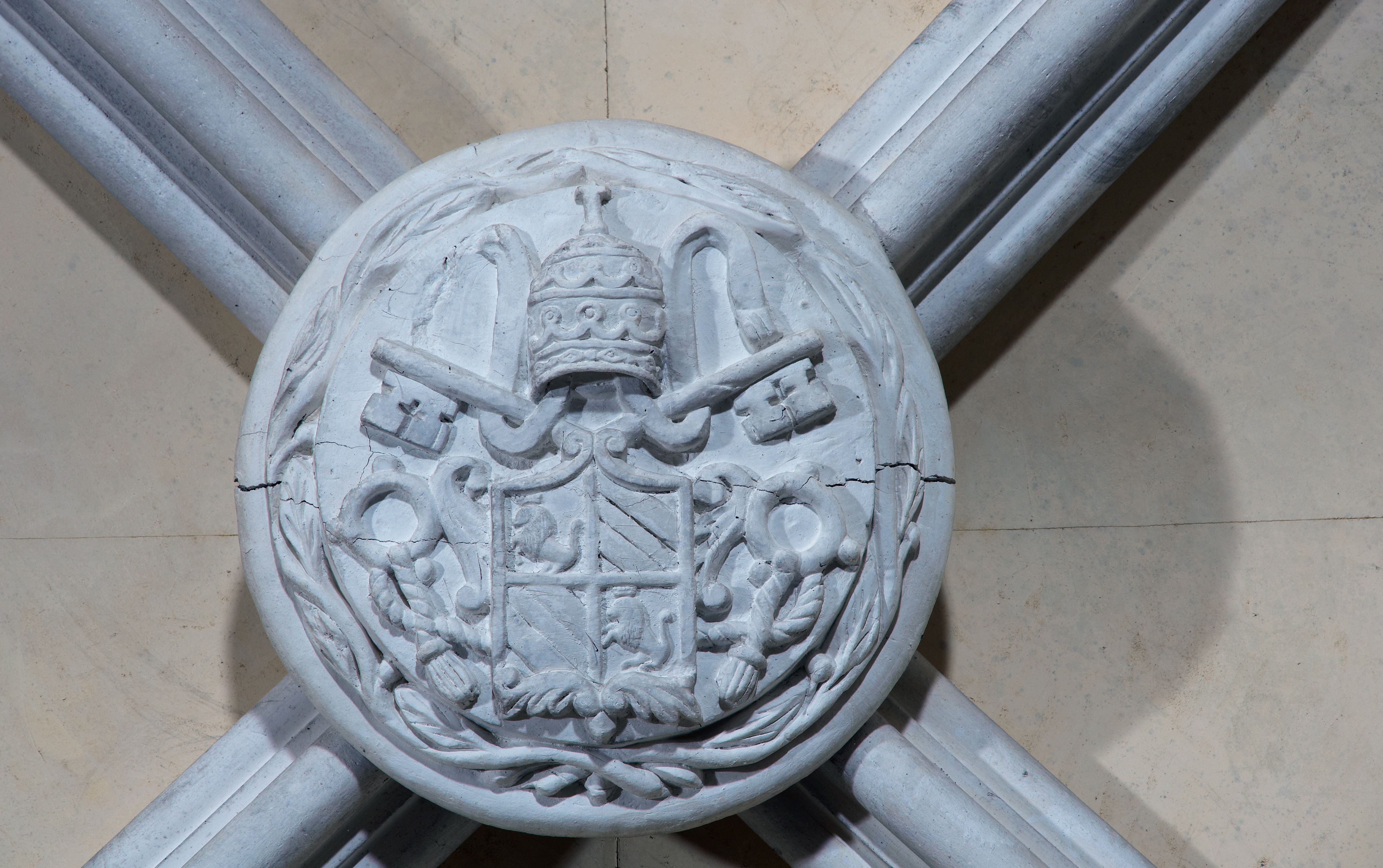 Rospez, le bourg : église paroissiale, clé de voûte décorée portant un blason et les armoiries papalesImmatriculation