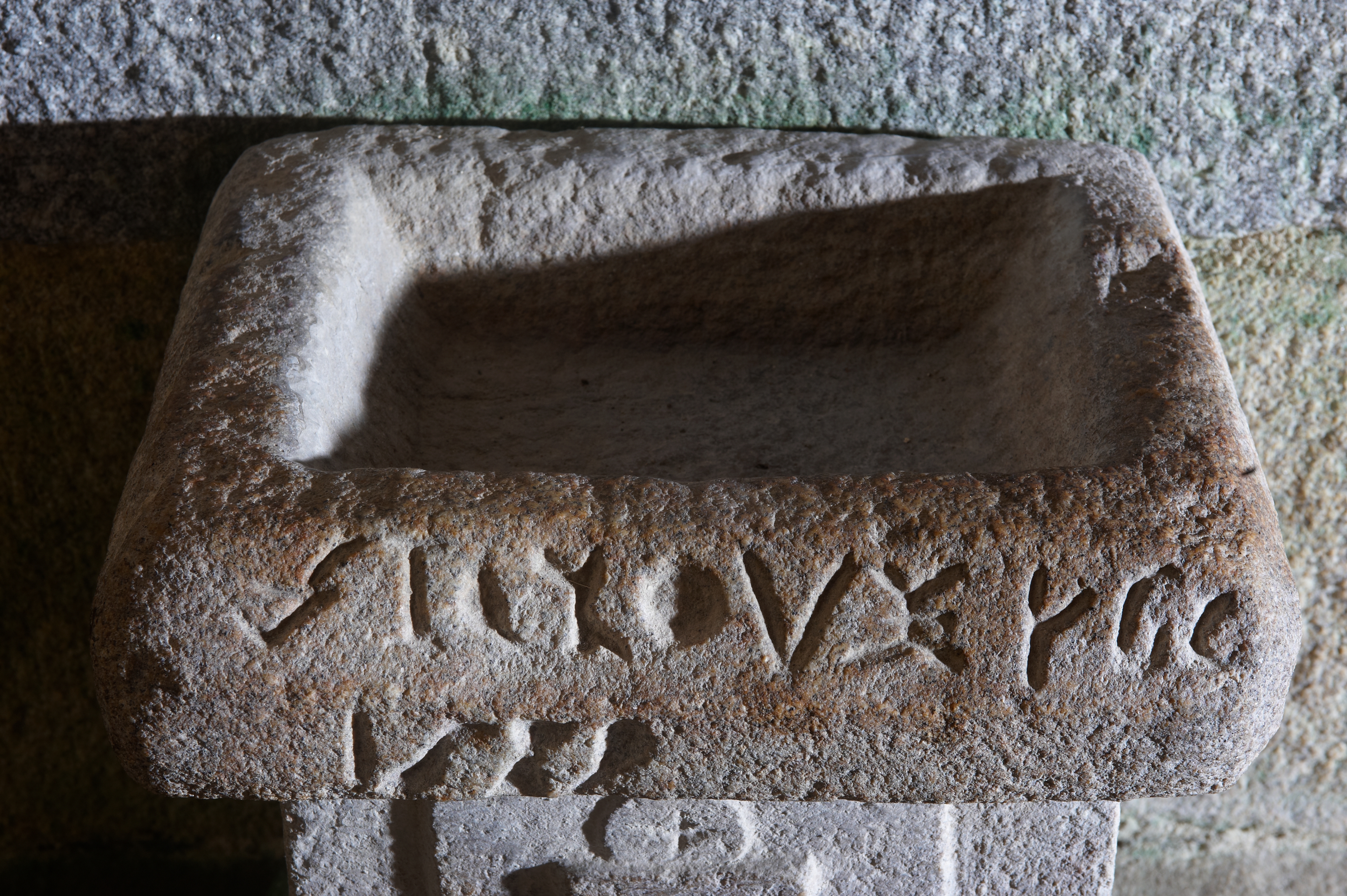 Rospez, le bourg : église paroissiale, détail des inscriptions et du millésime sur le bénitierImmatriculation