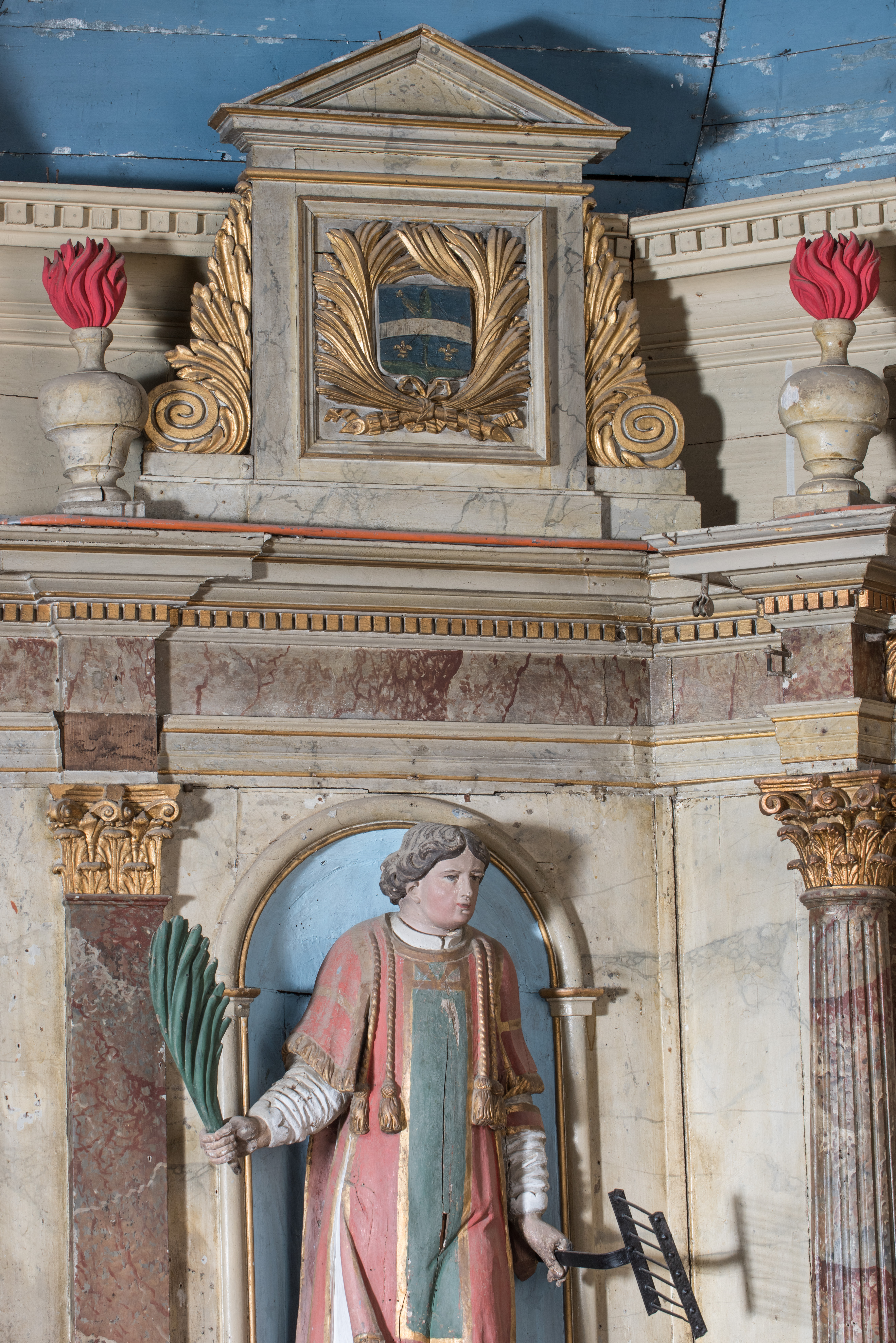 Statue de saint Laurent surmontée d'une armoirieImmatriculation