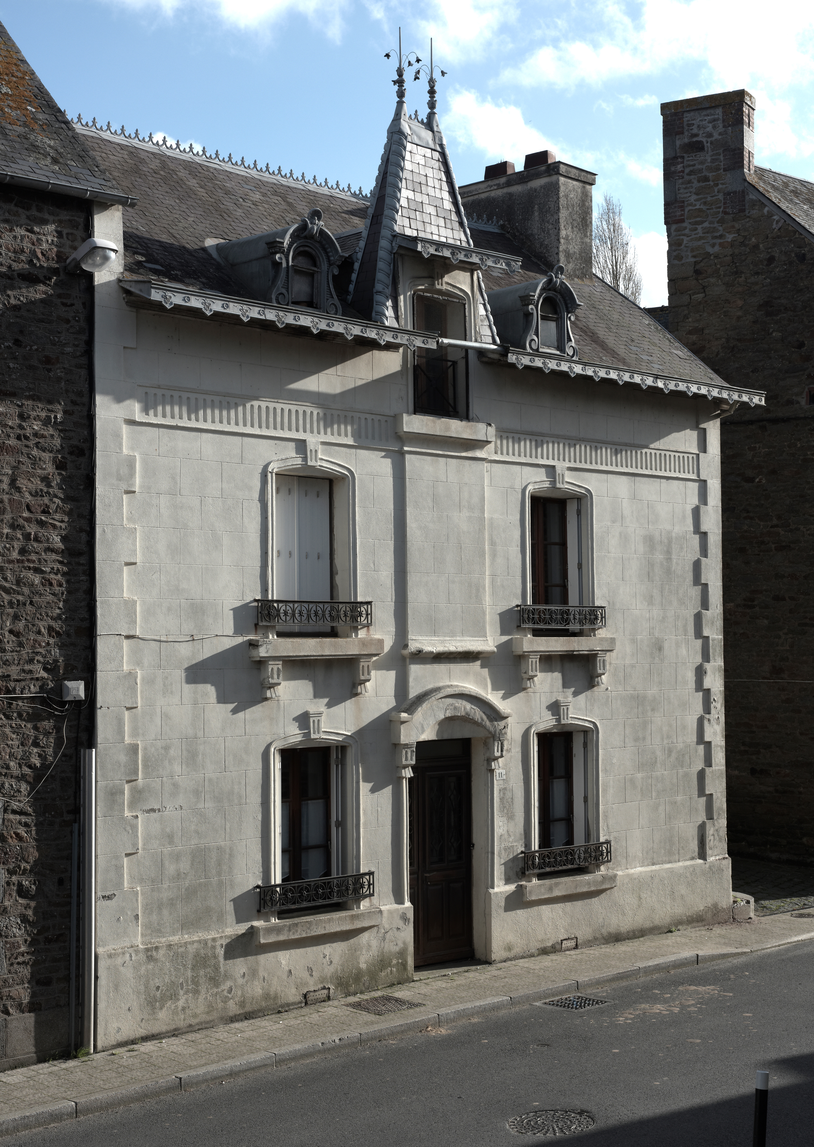 Rue de Dinan, maison de style pittoresque, vers 1900. Mise en valeur de la lucarne centrale par une toiture indépendante: petit pavillon garni d'épis de faitageImmatriculation