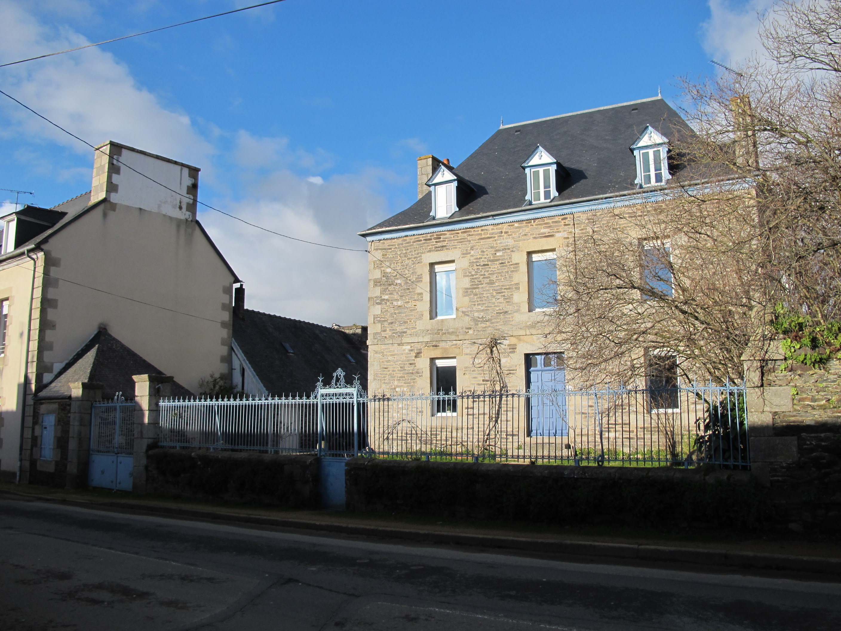 13 rue aux toiles. Maison du propriétaire terrien Crech'riou, 1850. Vue générale sud-est avec guérite d'entréeImmatriculation