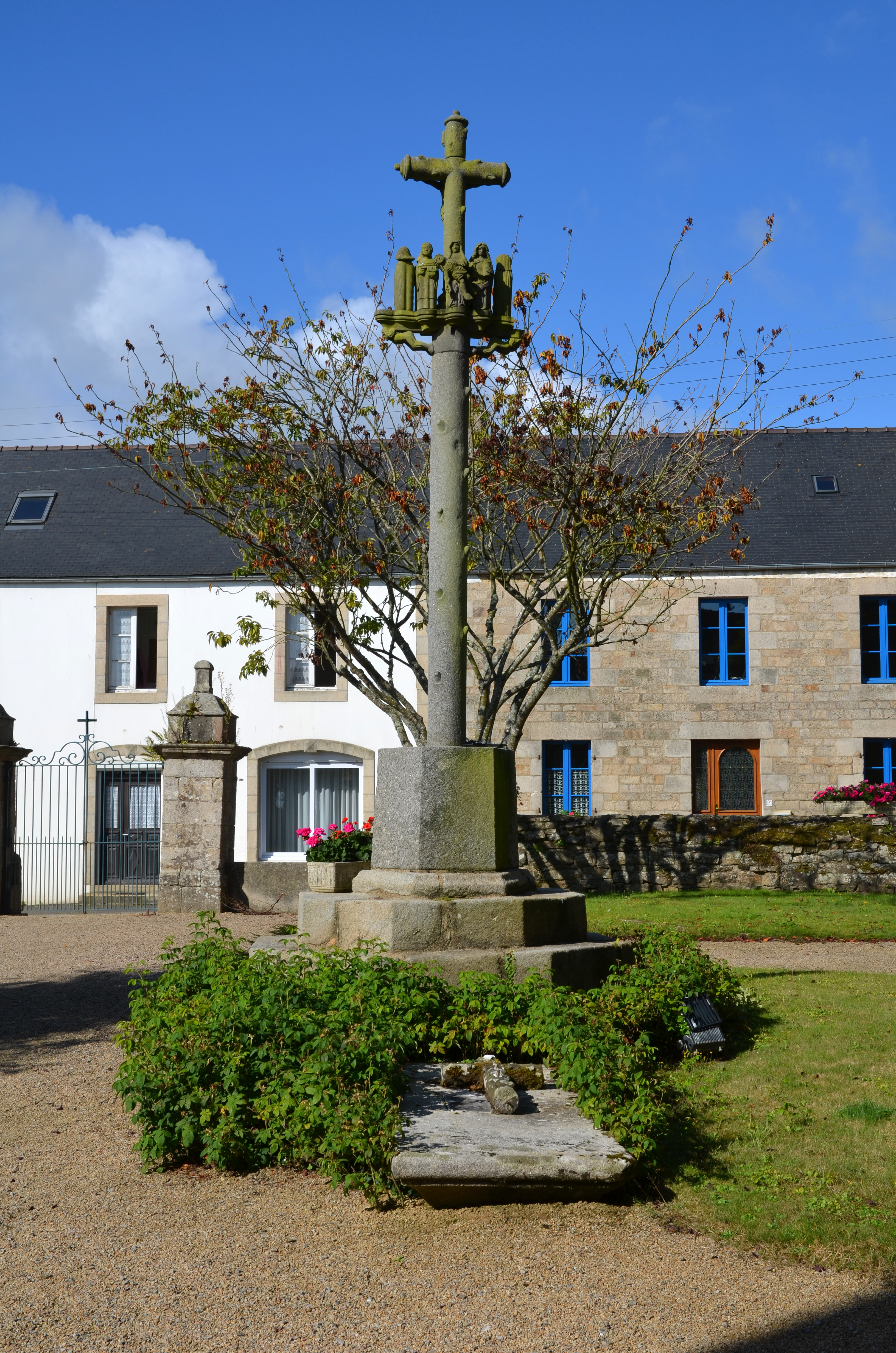 Trémel, le bourg : calvaire de l'église. Il porte l'inscription "MISSION 1865"Immatriculation
