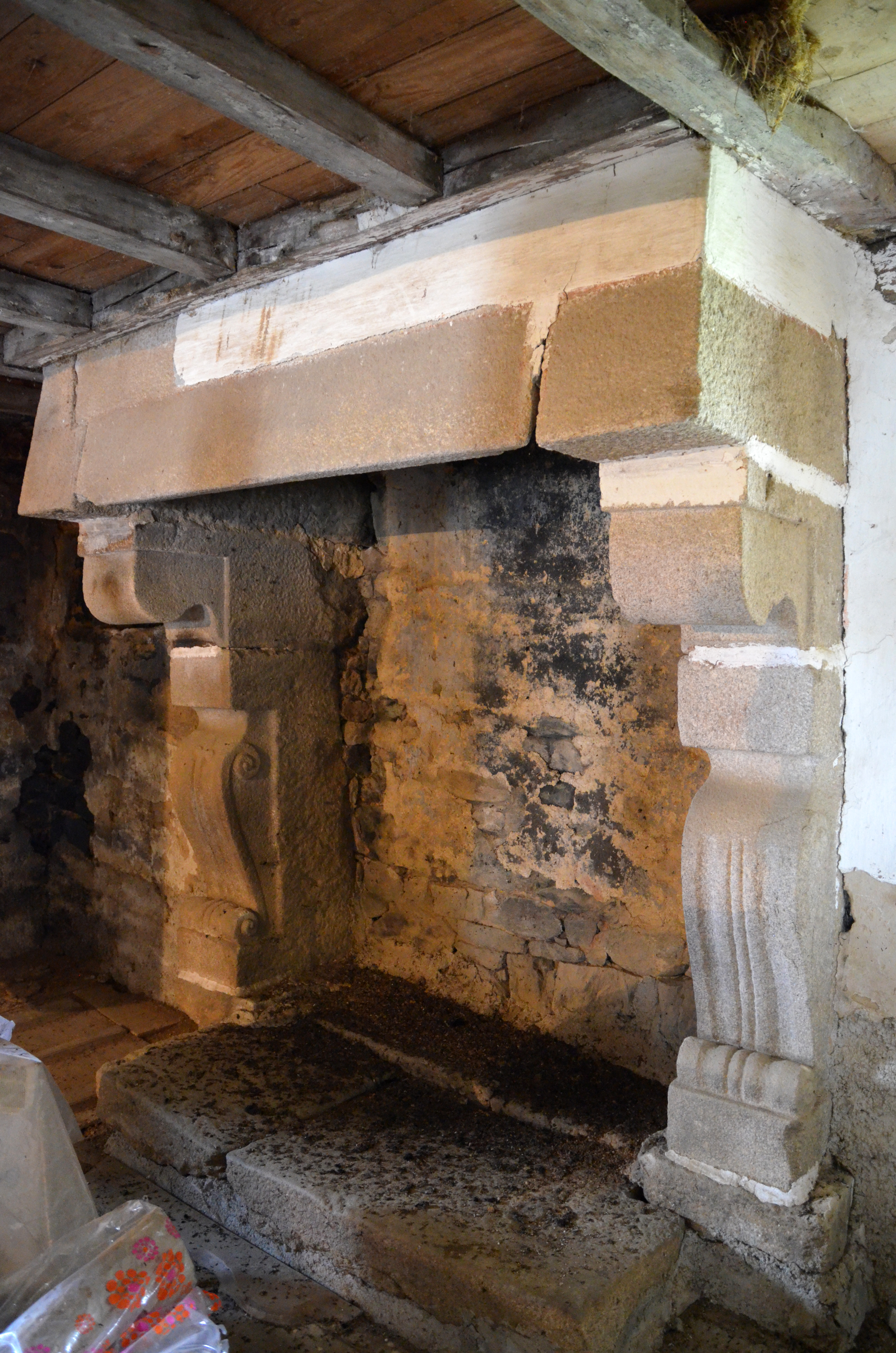 Trémel, Kerdudavel : manoir, vue intérieure, chambre haute, détail de la cheminée. Cette cheminée à cannelures est vraisemblablement datable des années 1620-1640Immatriculation