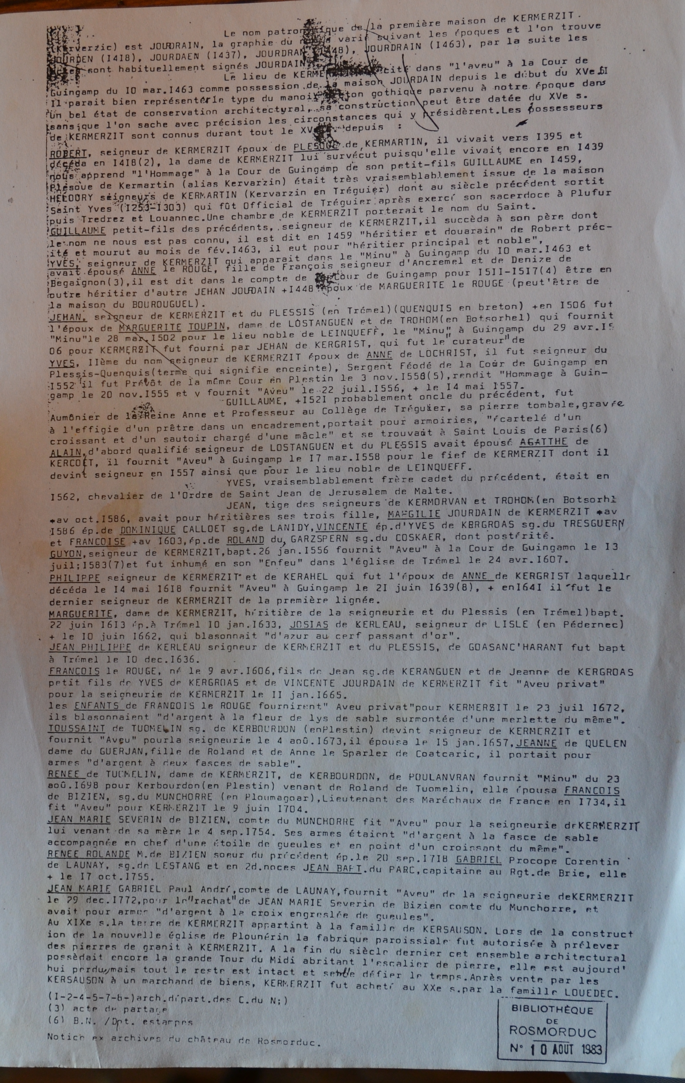 Extrait des archives de la Bibliothèque de Rosmorduc concernant le manoir de KermerzitImmatriculation