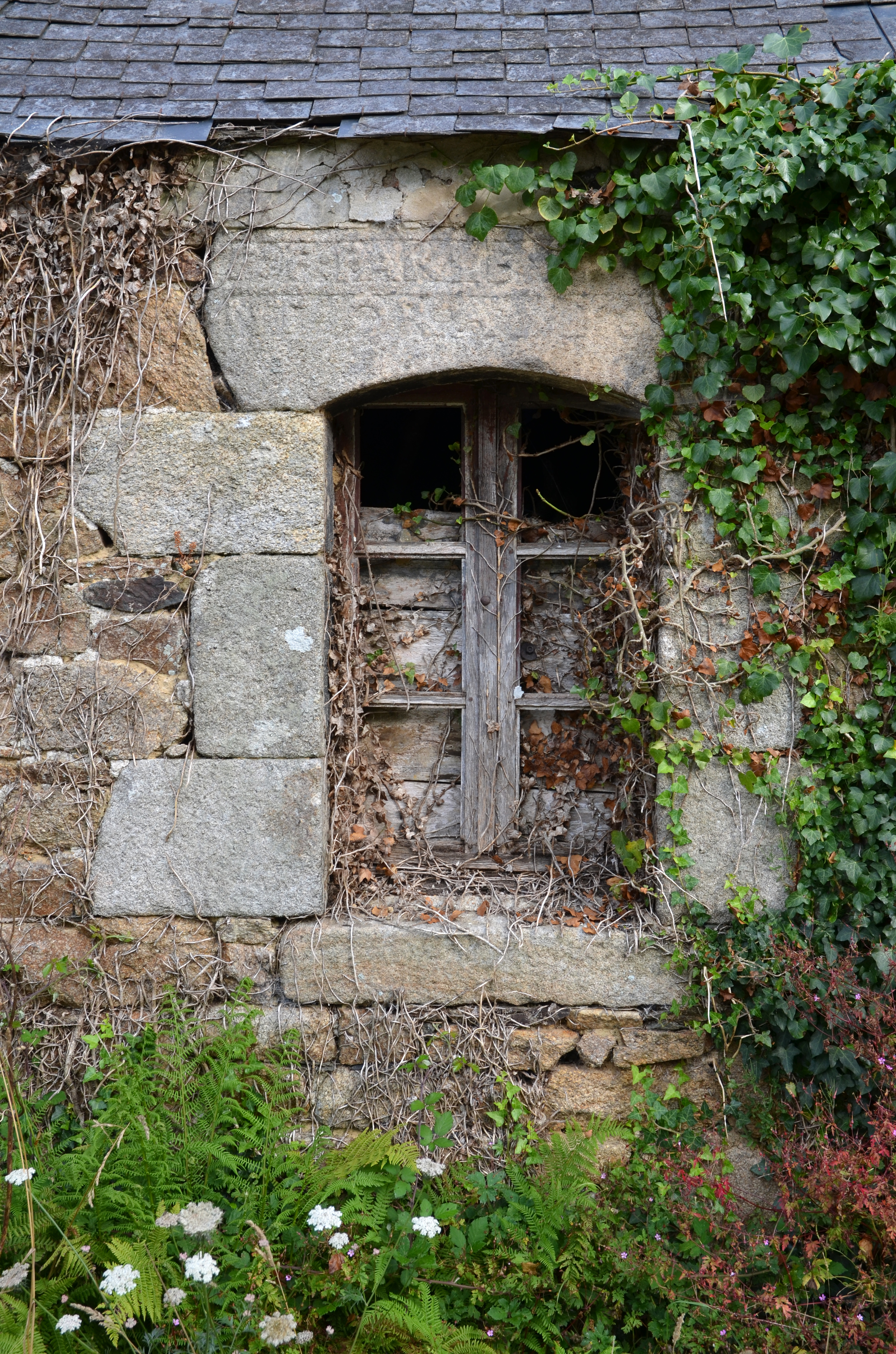 Trémel, Kerharo : ferme, élévation antérieure orientée vers le sud-sud-est, détail d'un linteau portant une inscription et un millésimeImmatriculation