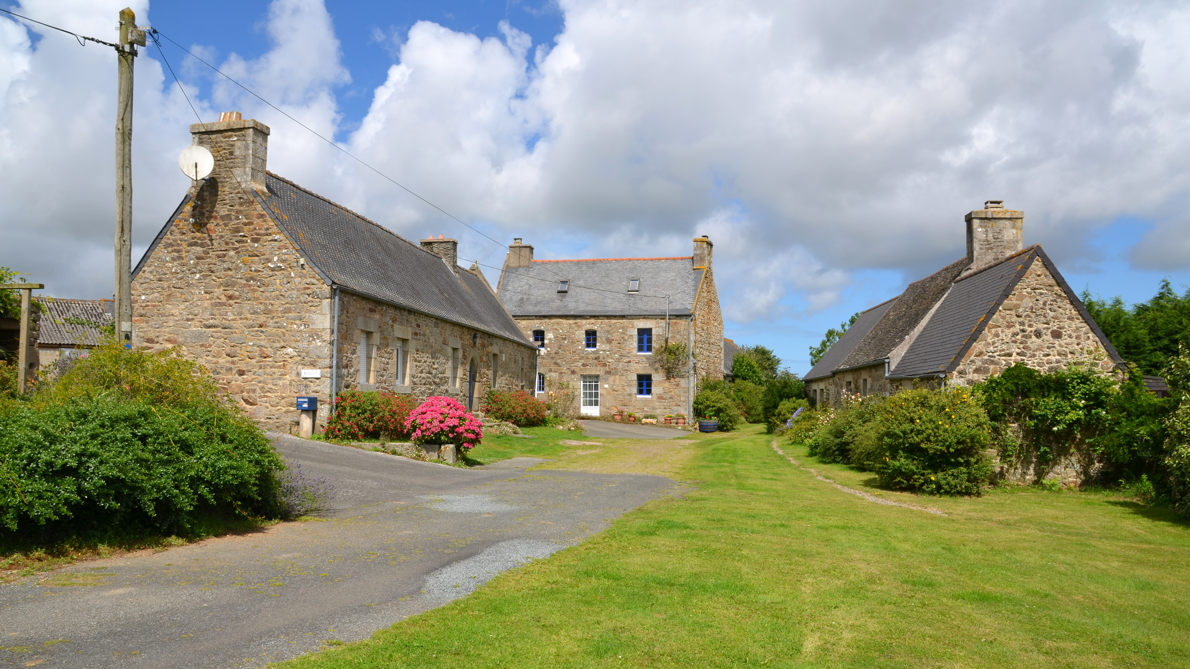 Trémel : vue générale de l'écart ou hameau de Kerouel depuis le sud. A gauche : logis ou dépendance datble de la 2e moitié du 16e siècle (porte moulurée en arc plein cintre, petite fenêtre à appui saillant, rampants...)Immatriculation