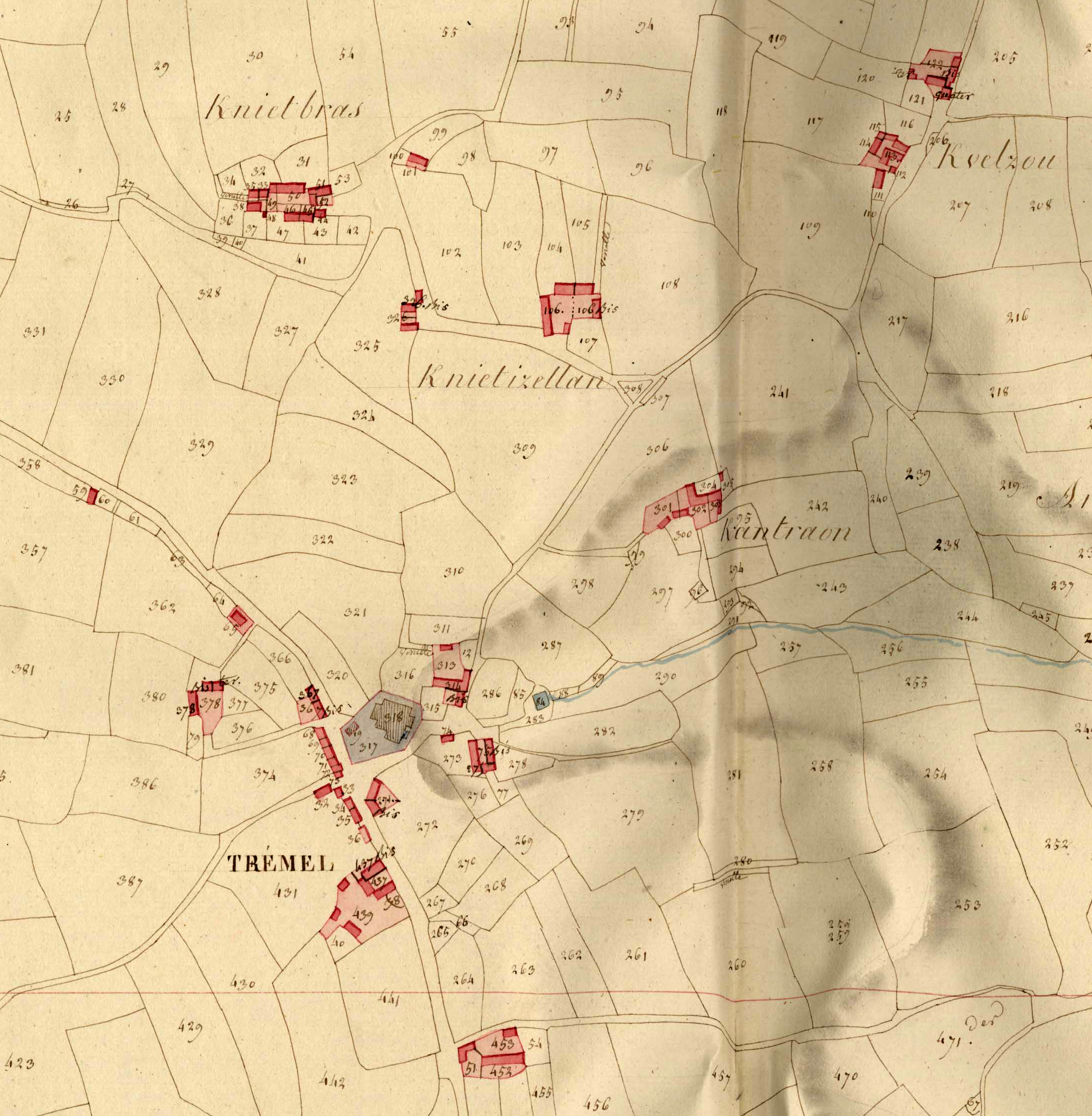 Extrait du cadastre ancien de la commune de Trémel, 1814 : le bourg (l'église et son ossuaire - aujourd'hui détruit, sont lavés en bleu)Immatriculation