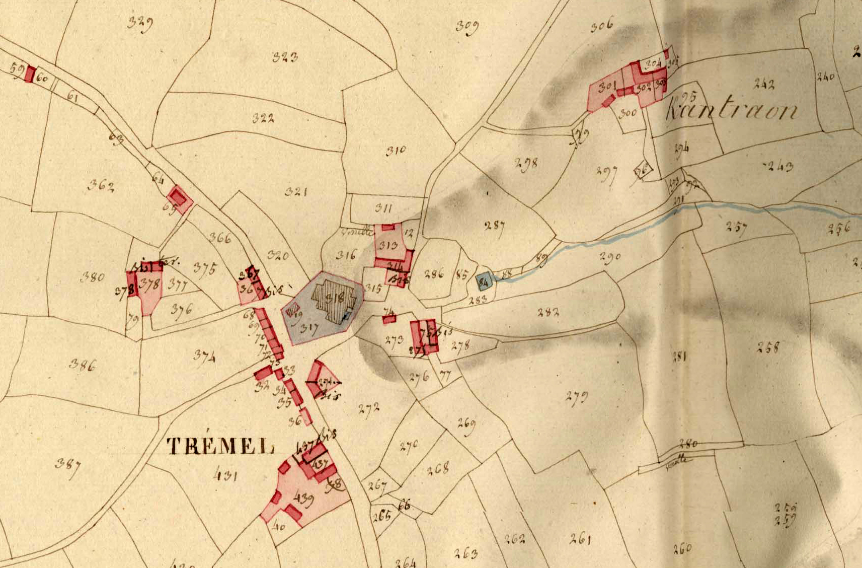 Extrait du cadastre ancien de la commune de Trémel, 1814 : le bourg (l'église et son ossuaire - aujourd'hui détruit, sont lavés en bleu)Immatriculation
