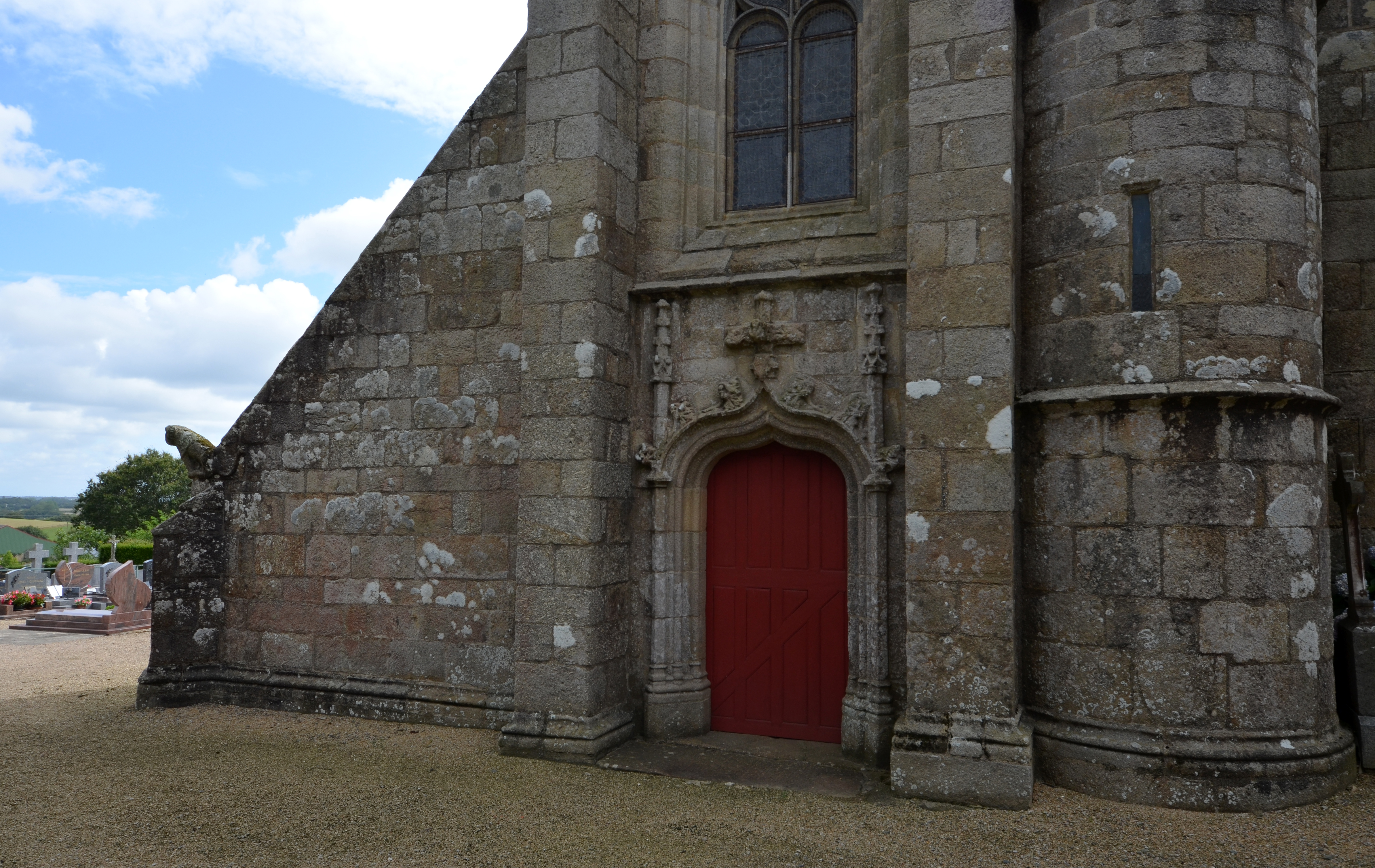 Trémel, le bourg : église paroissiale Notre-Dame, clocher-mur et porte ouestImmatriculation