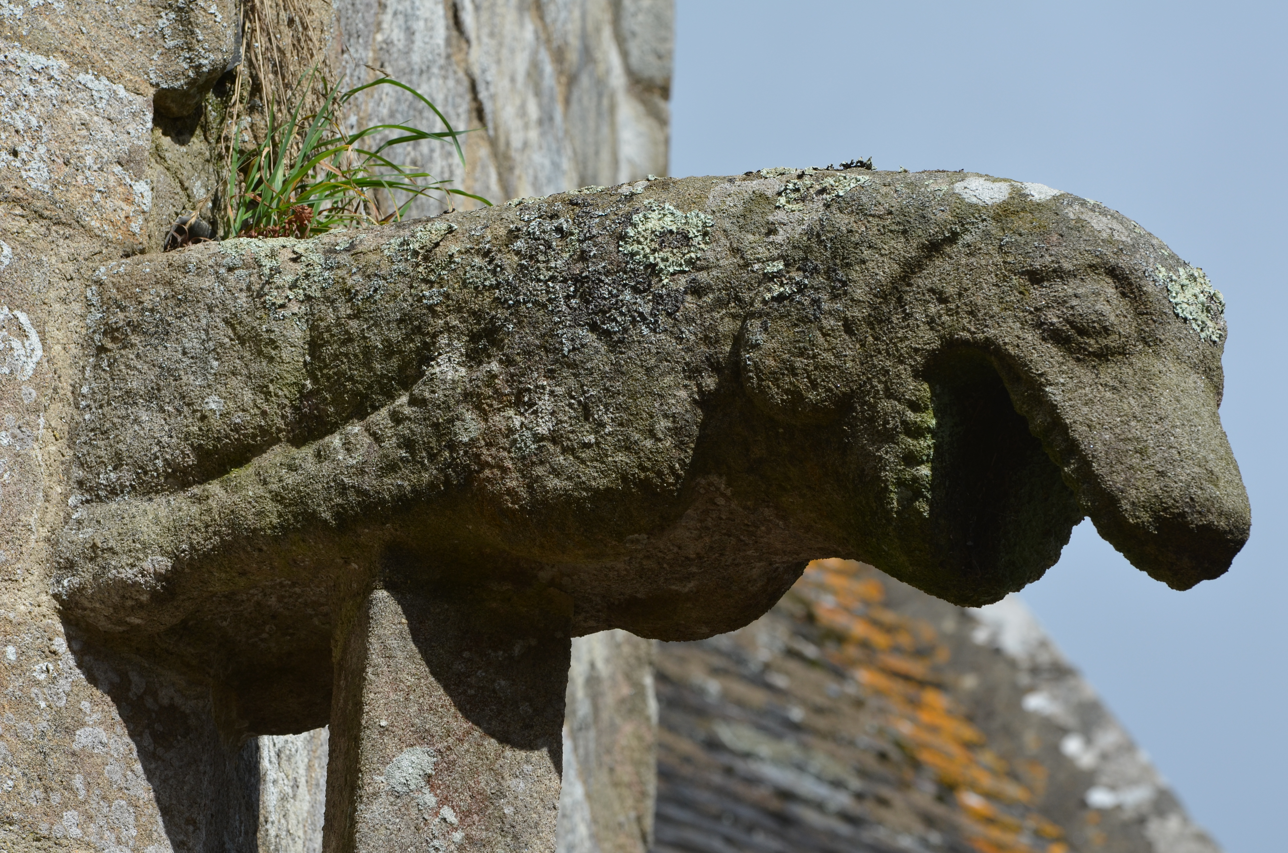 Trémel, le bourg : église paroissiale Notre-Dame, chevet à noues multiples, détail de l'une des crossettes sculptéesImmatriculation