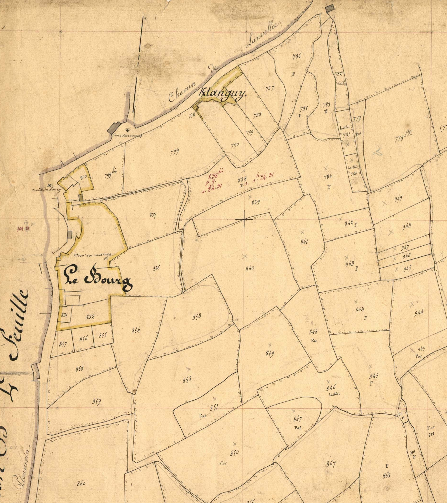 Extrait du cadastre ancien de la commune de Plufur, 1848 : le bourg (est)Immatriculation