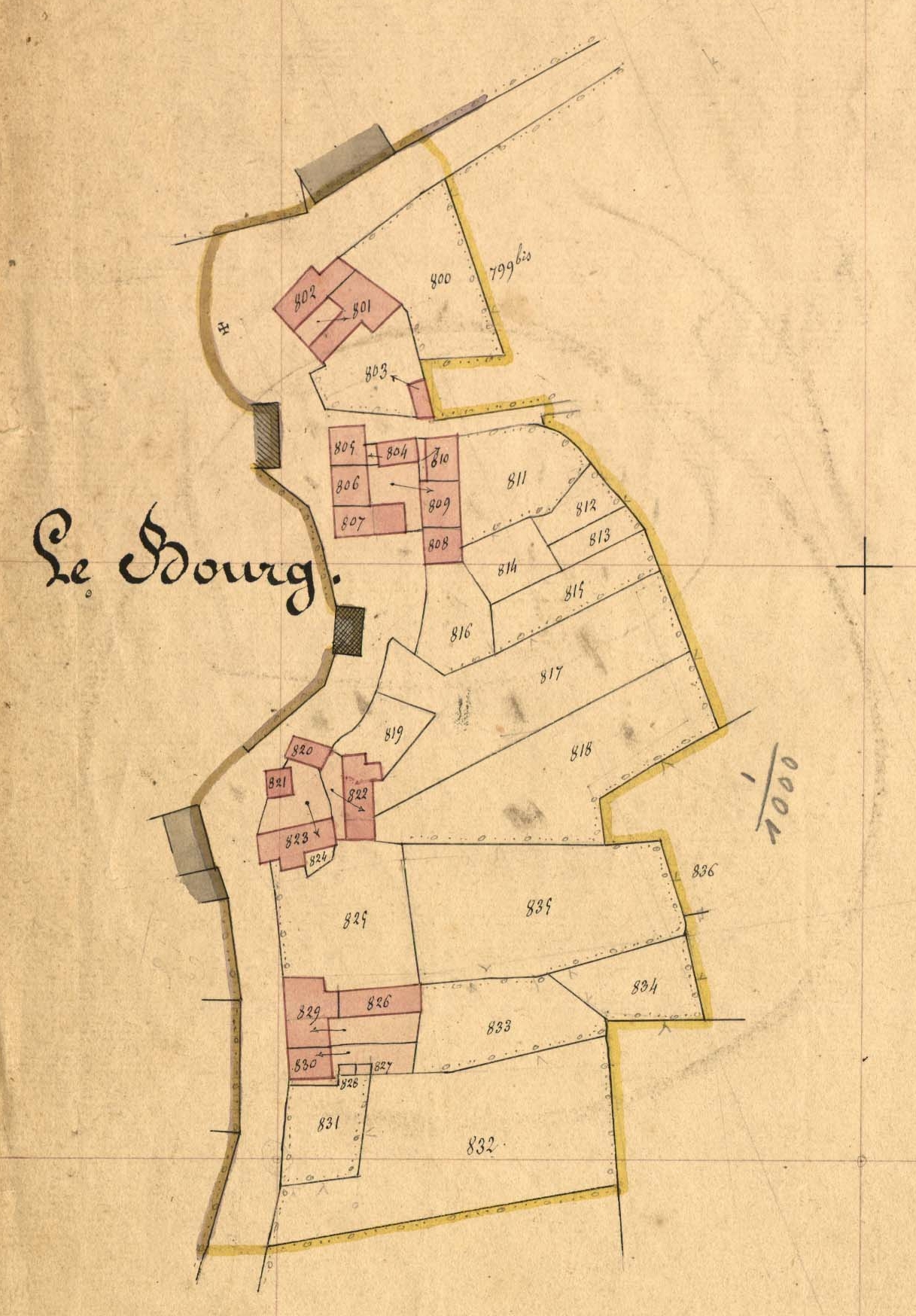 Extrait du cadastre ancien de la commune de Plufur, 1848 : le bourg (est)Immatriculation