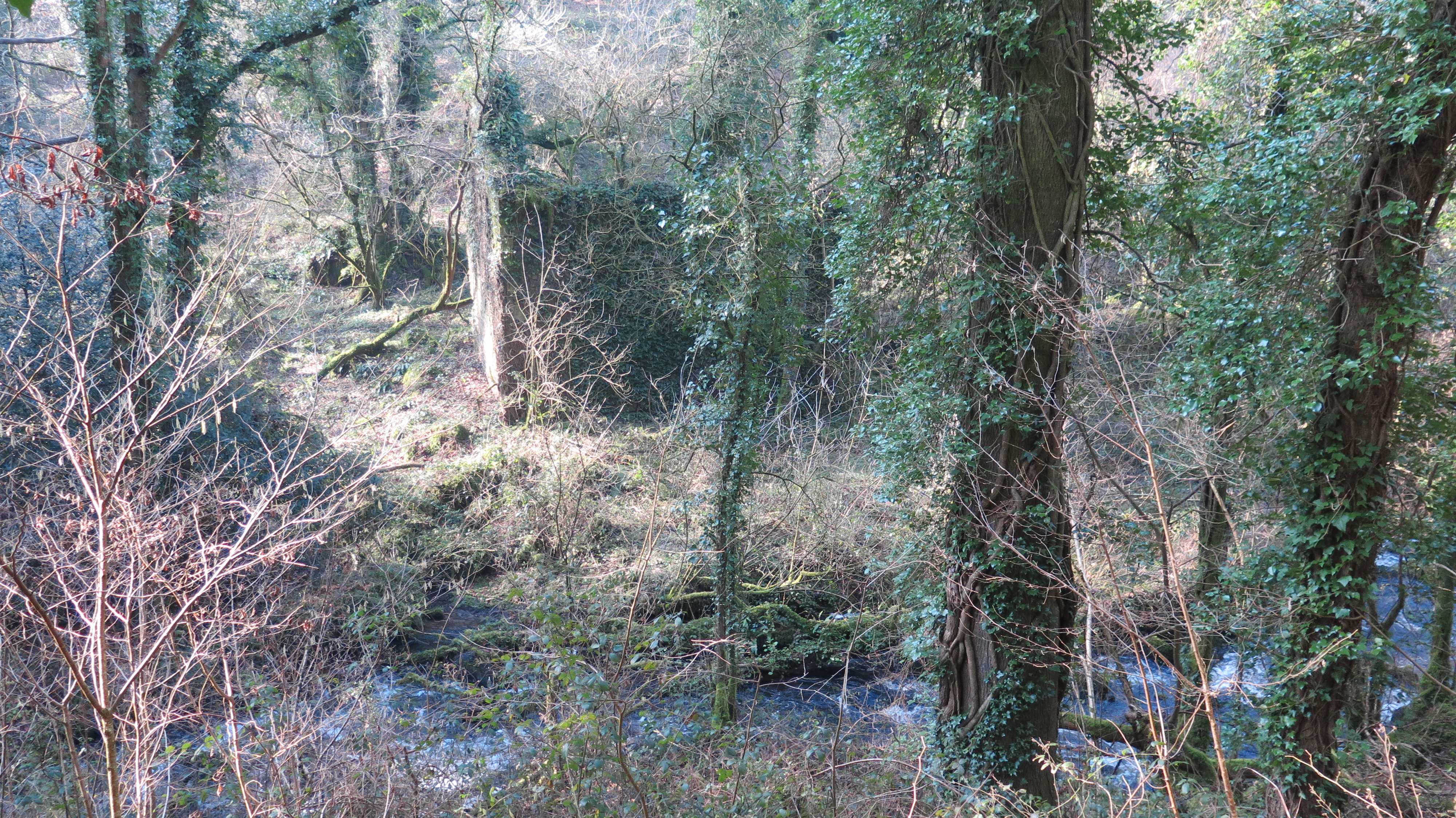 Plufur : site de la chaussée - digue du moulin à eau de Kerprigent à Plounérin. Côté Plounérin, on distingue dans la végétation les vestiges du moulin à eauImmatriculation