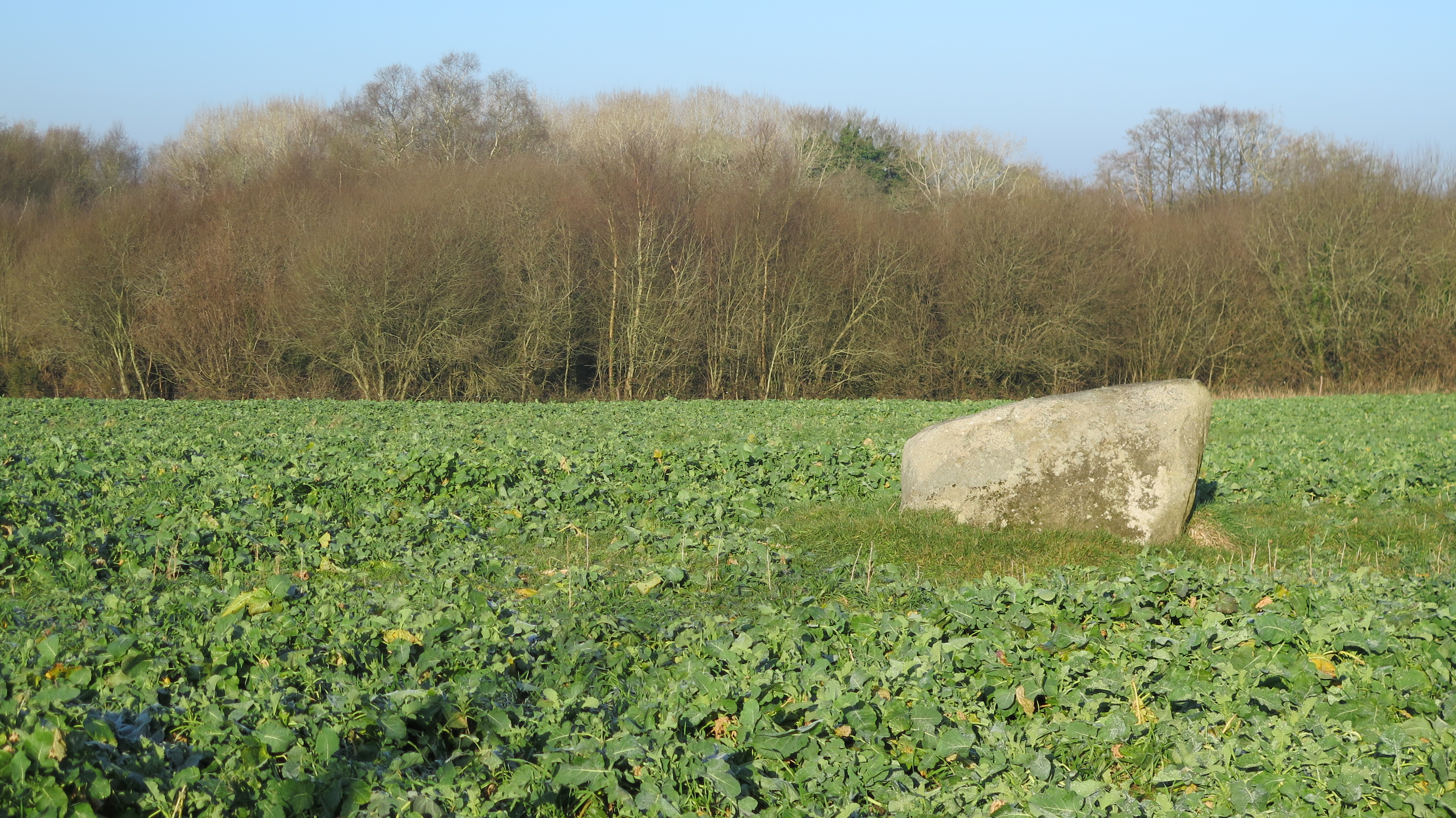 Plufur, entre Roc'h ar Hed et Run ar Manac'h : bloc de granite dans un champ. On distingue des traces de débitImmatriculation