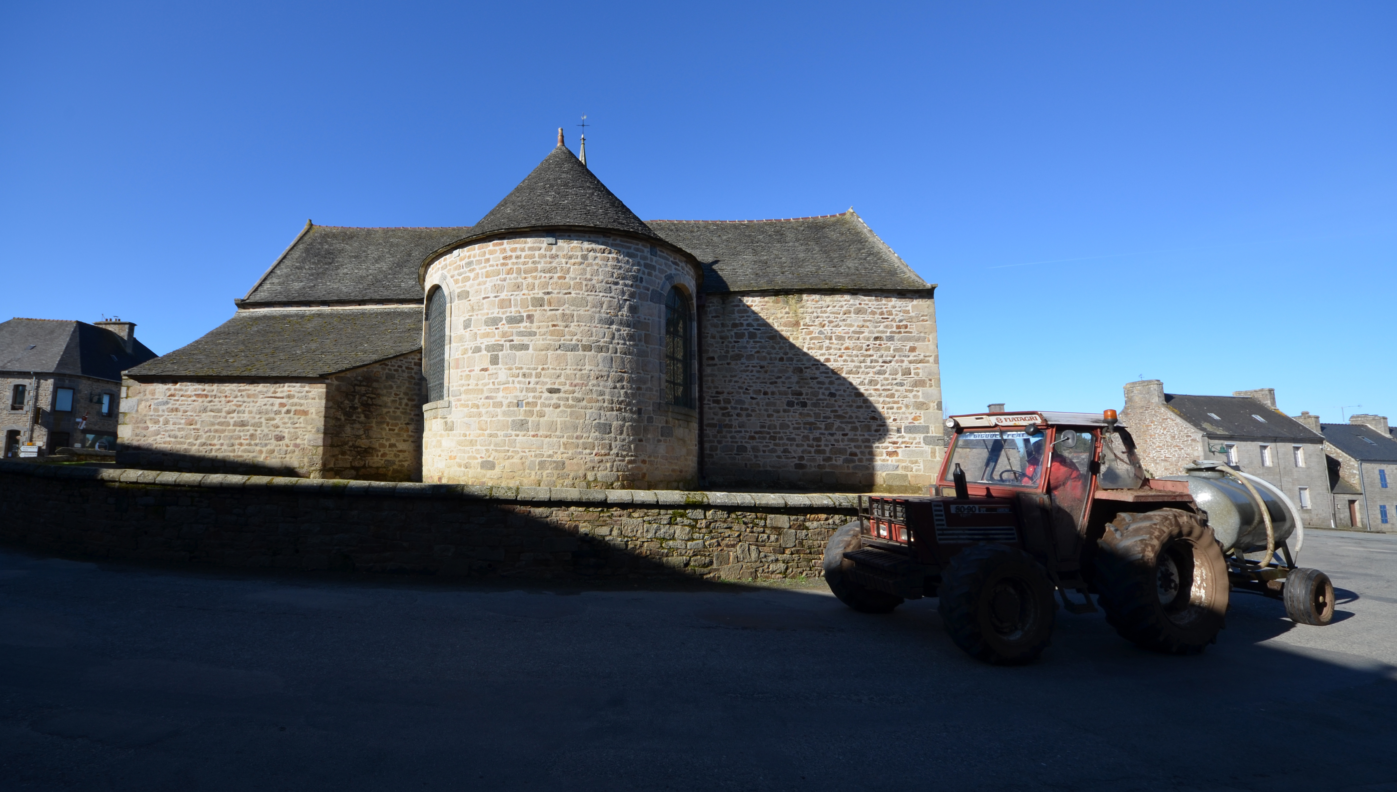 Plufur, le bourg : église paroissiale Saint-Florent, vue générale du chevet avec abside en hémicycle percée de deux baies latéralesImmatriculation