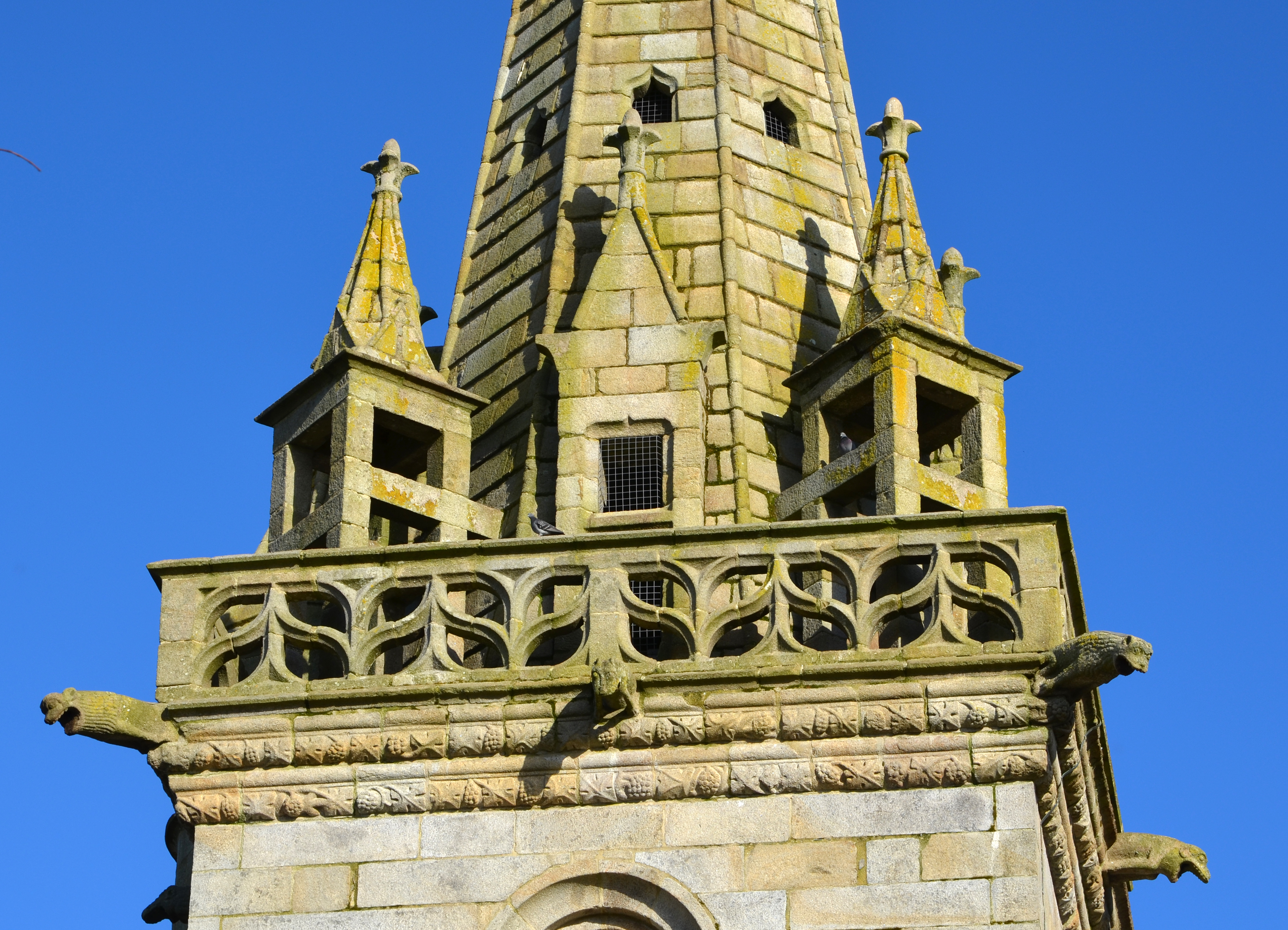 Plufur, le bourg : église paroissiale Saint-Florent, vue du clocher, plate-forme bordée d'une balustrade flamboyante (remploi ?)Immatriculation
