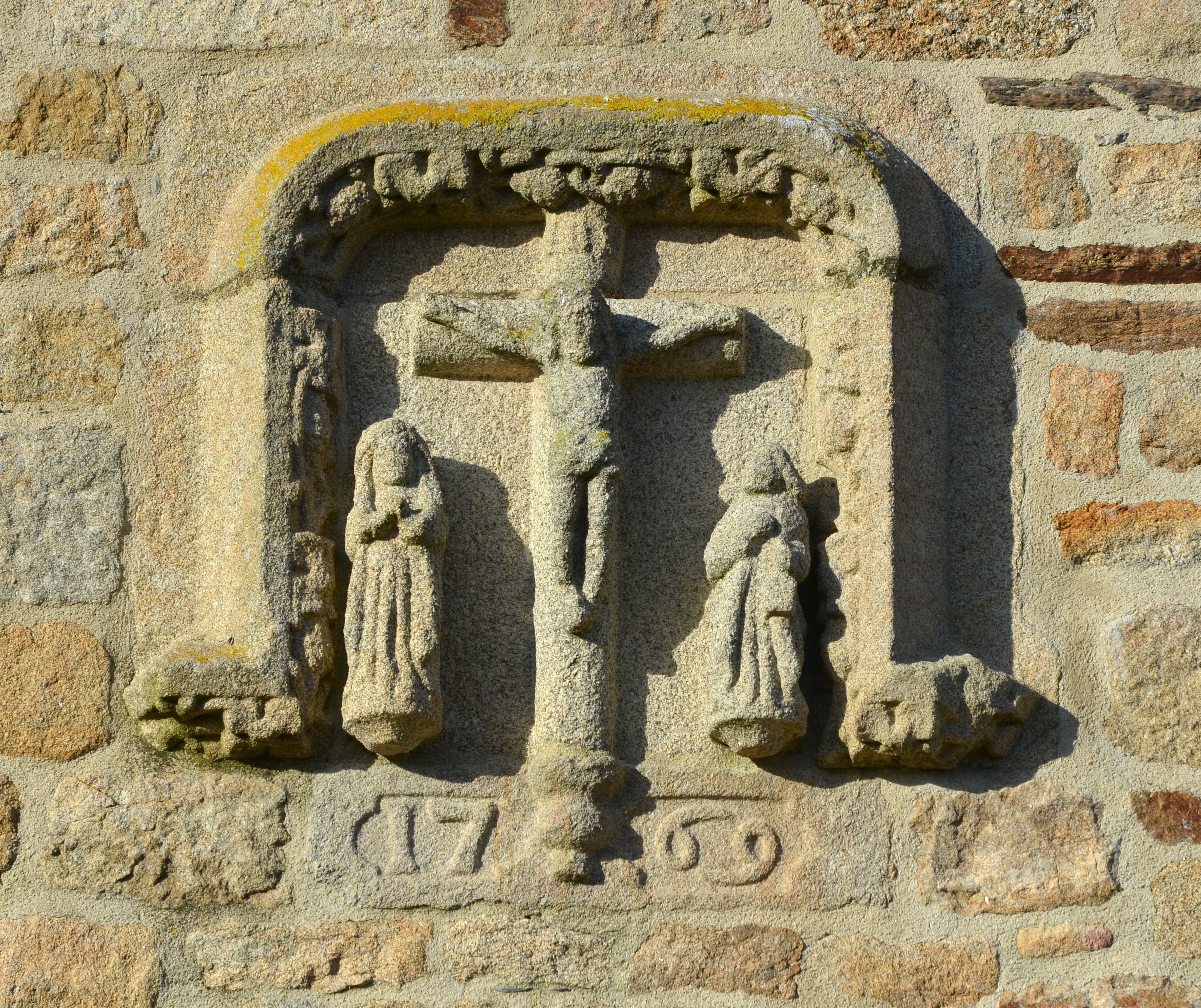 Plufur, le bourg : église paroissiale Saint-Florent, détail du transept sud, croix datée de 1769Immatriculation