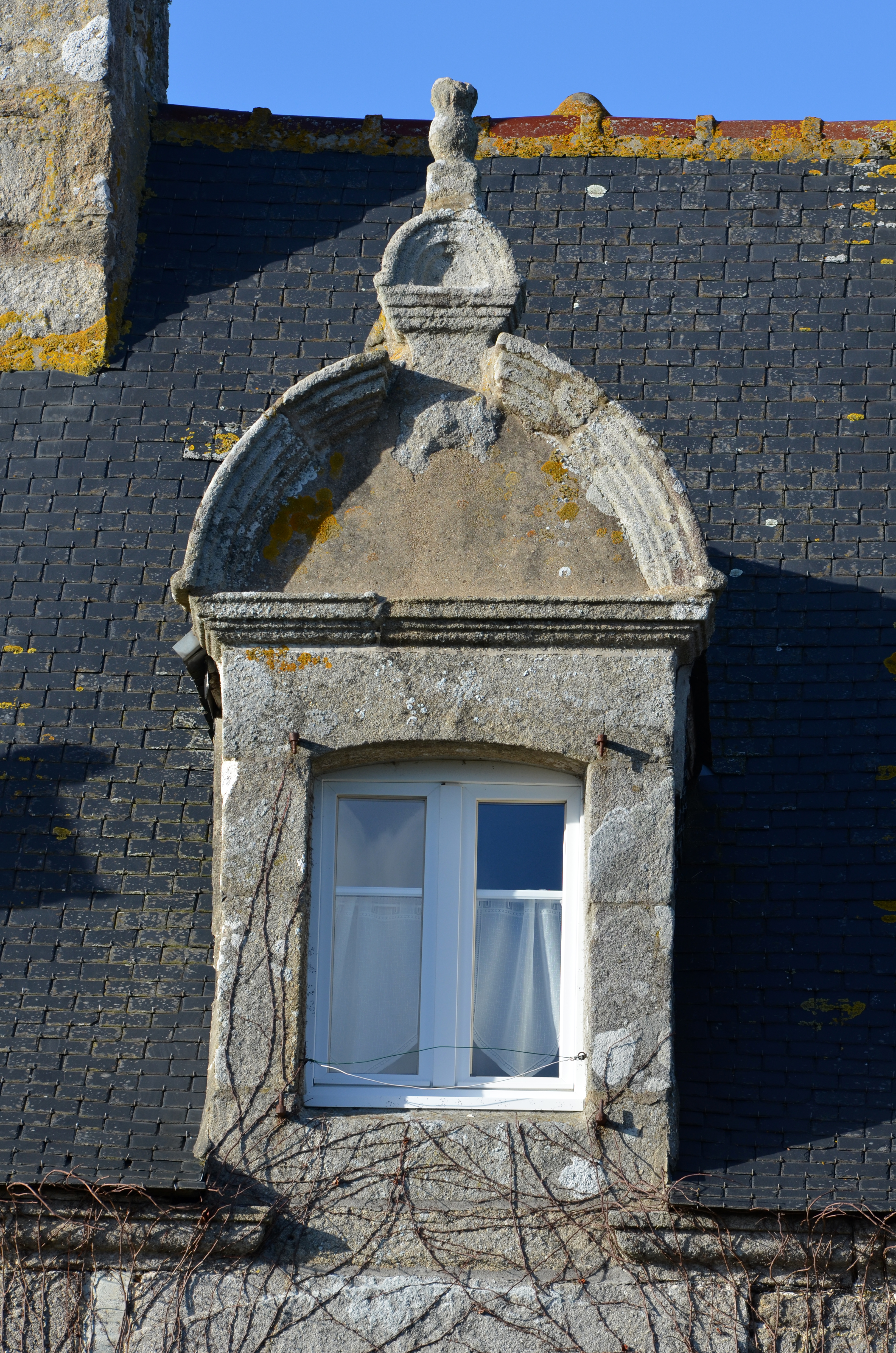 Plufur, le bourg : presbytère, détail de la lucarne axiale au fronton curviligneImmatriculation