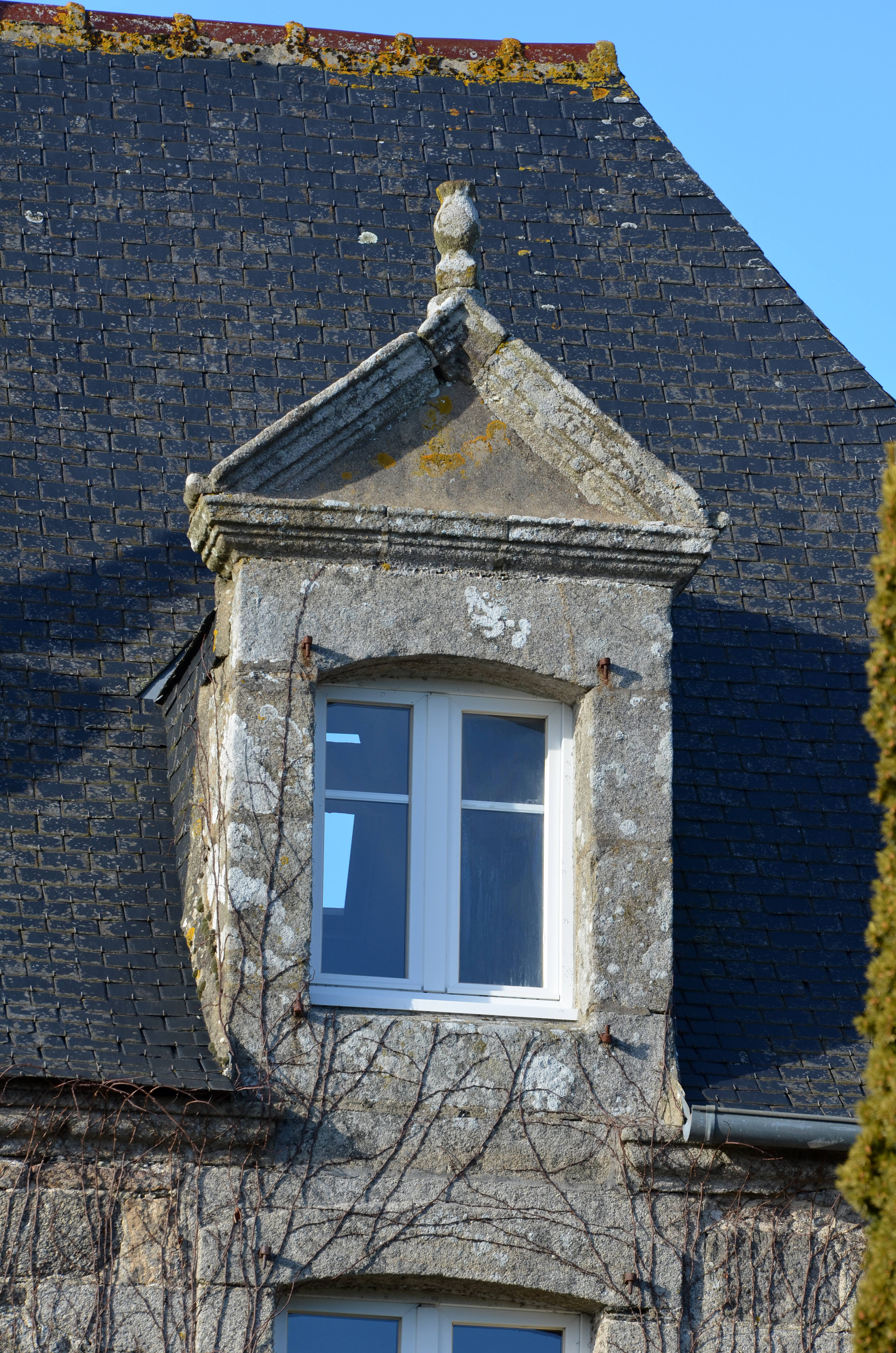 Plufur, le bourg : presbytère, détail de la lucarne est au fronton triangulaireImmatriculation
