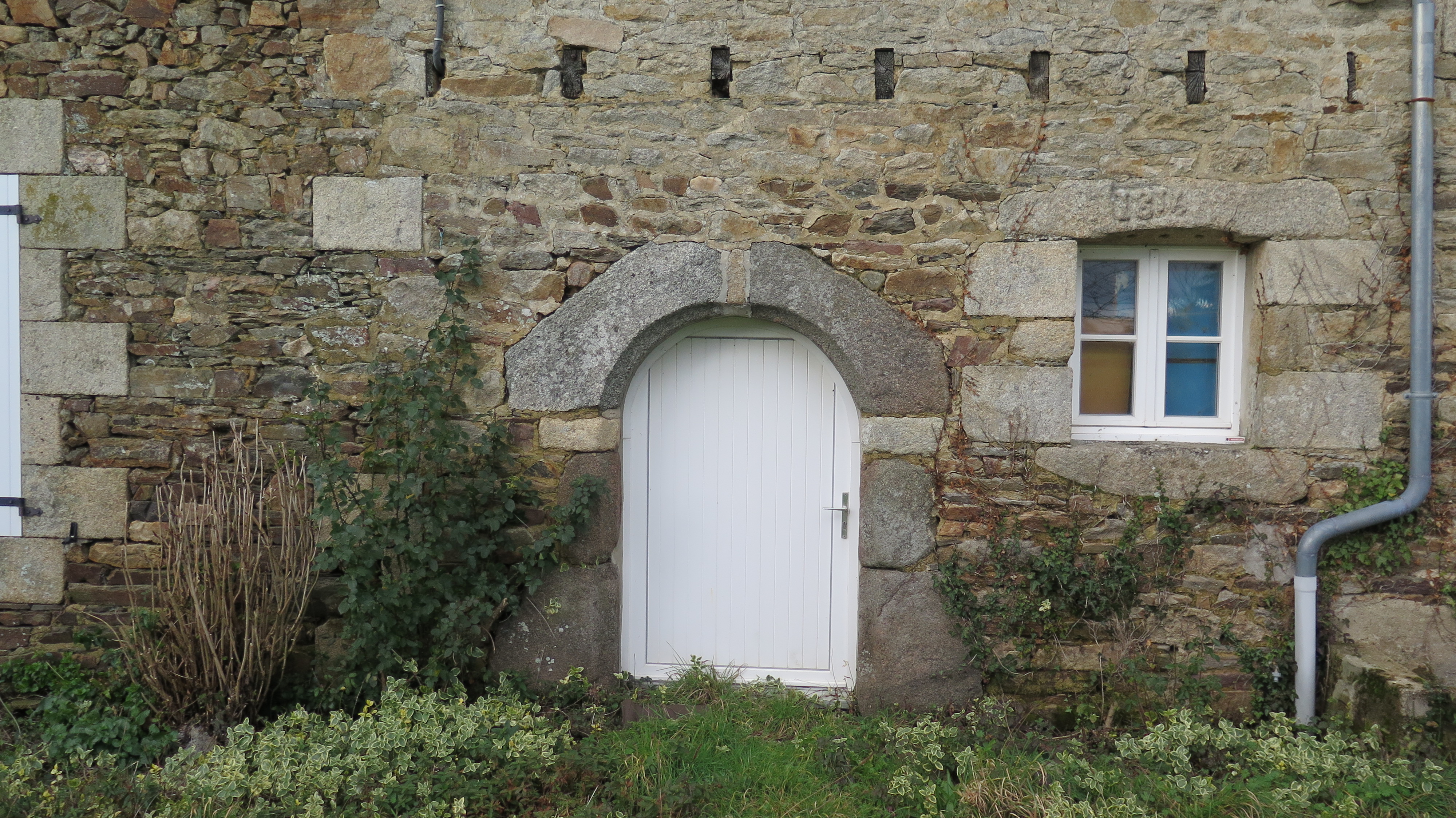 Plufur, Kerglujar : ferme, détail de l'élévation antérieure orientée vers le sud (porte en arc plein cintre du 16e siècle, fenêtre datée de 1814, et modifications datables de la deuxième moitié du 19e siècle)Immatriculation
