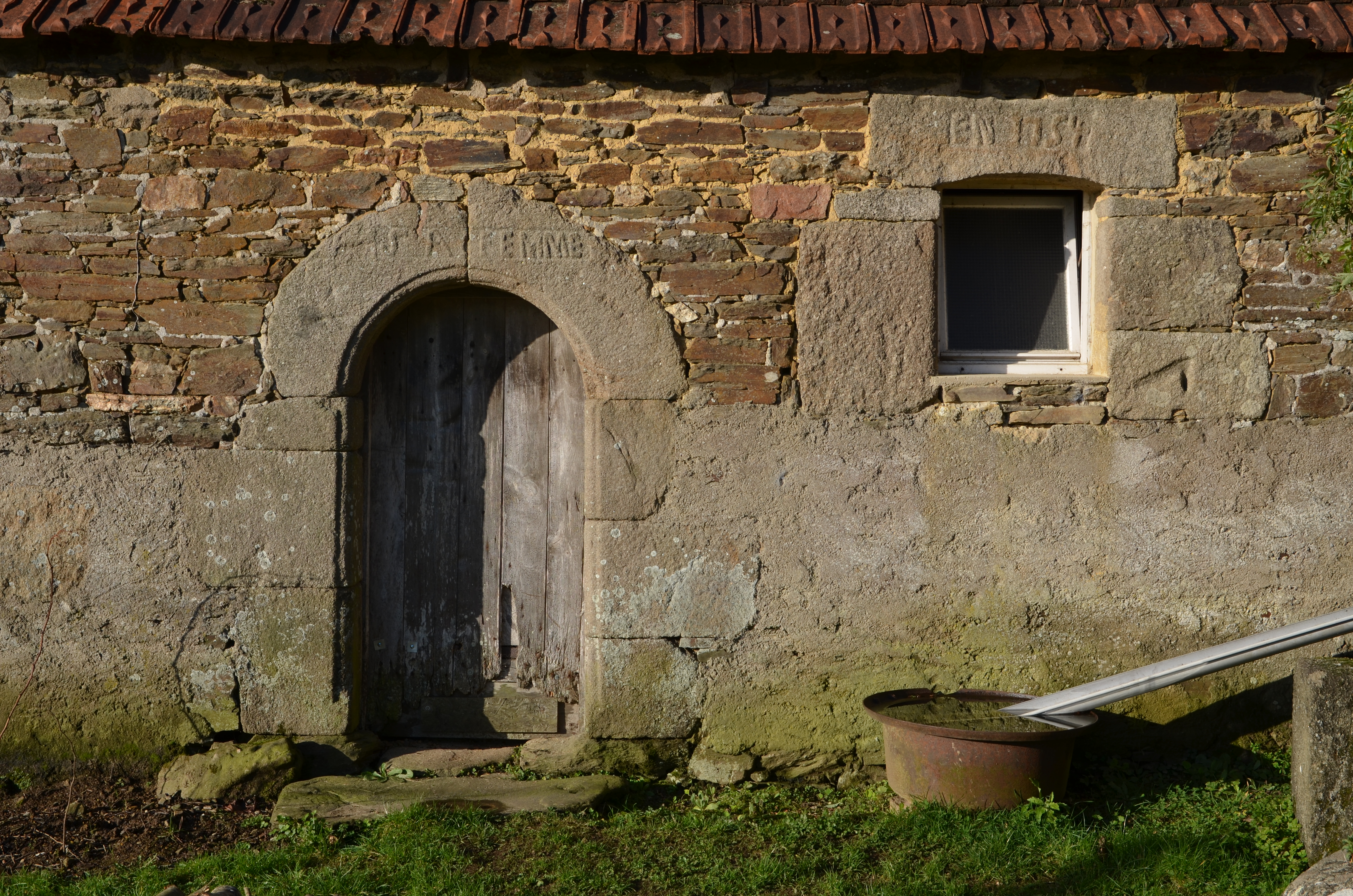 Plufur, Kerviniou : ferme déclassée en dépendance, élévation antérieure orientée vers l'est. Sur les pierres, on peut lire : "SA FEMME / EN 1754"Immatriculation